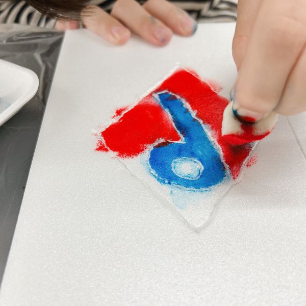 広い面は、スポンジなどでトントン軽く叩くように、まんべんなく絵の具をのせていきます。1色刷って確かめて、次の色をのせるとどうなるのかな?と想像しながらの制作をすすめました。