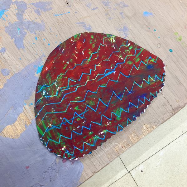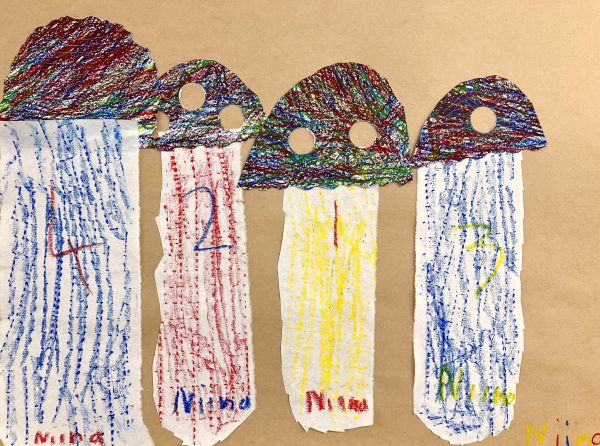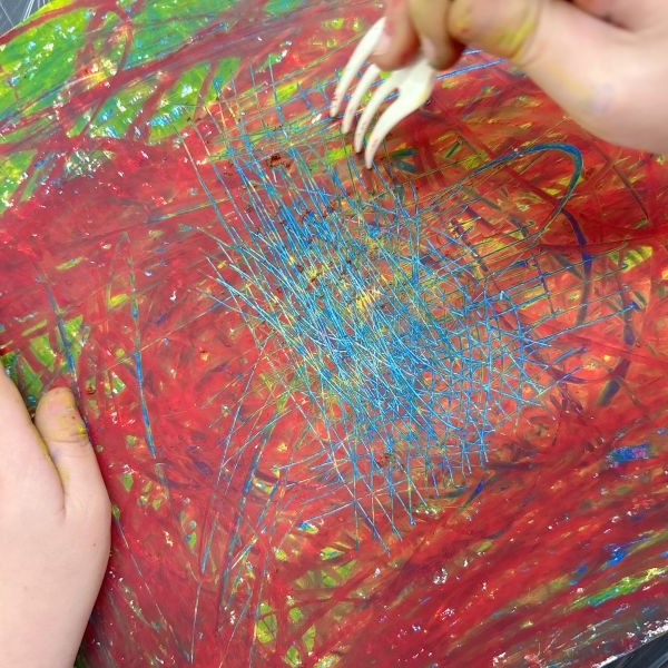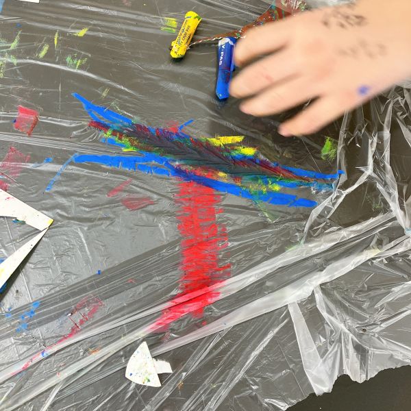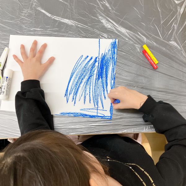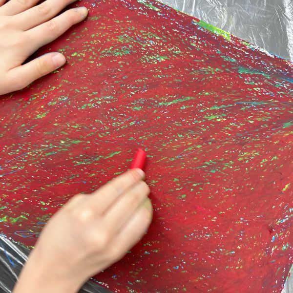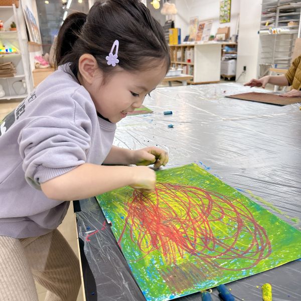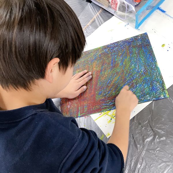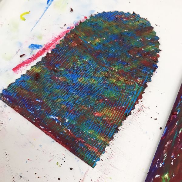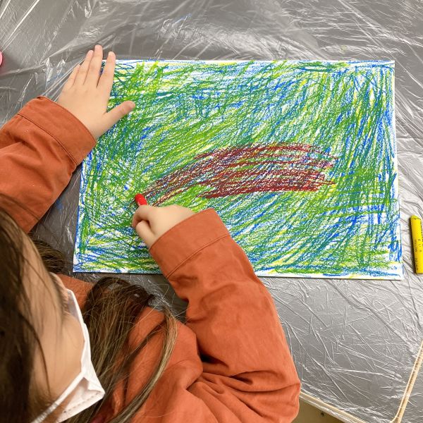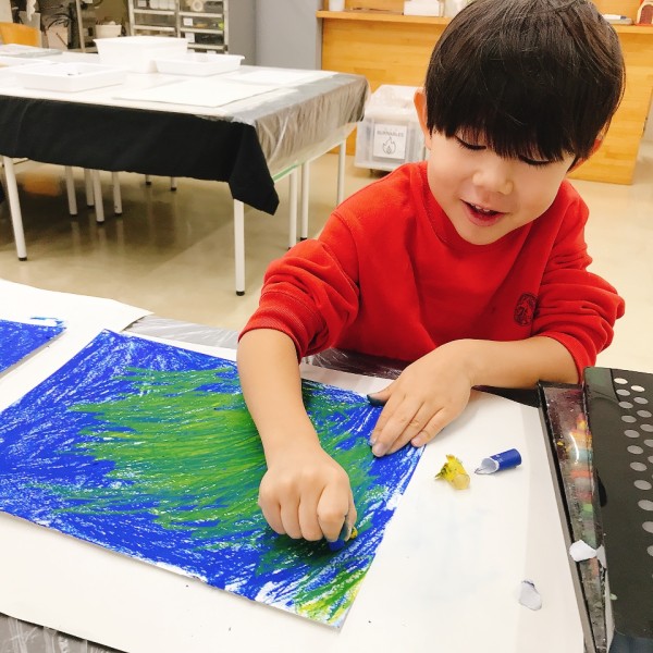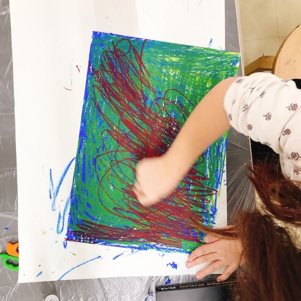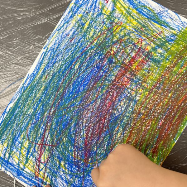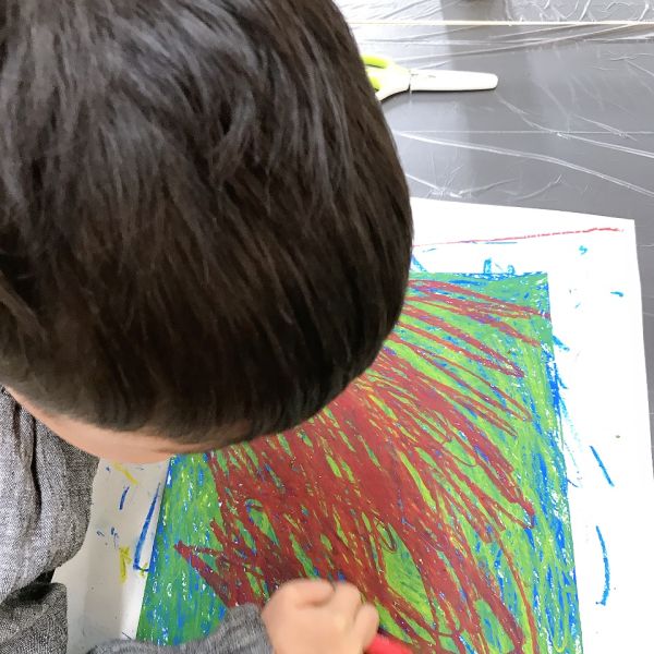 先が尖った道具を見つけ、スクラッチして好きな模様を描いている子も。しっかり塗り重ねたクレヨンの層があるから、ご覧の通り。はじめに塗った青や黄色が見えて、一気にカラフル!