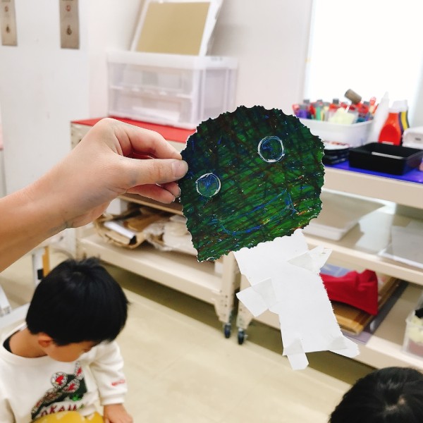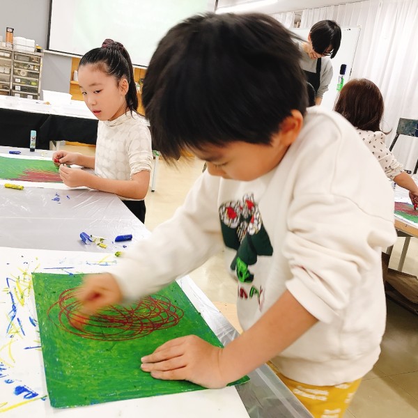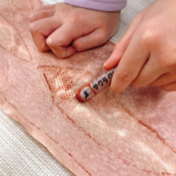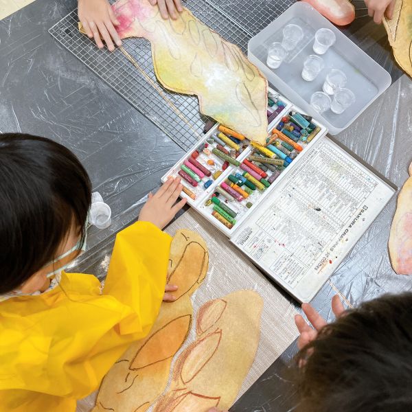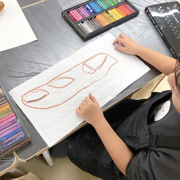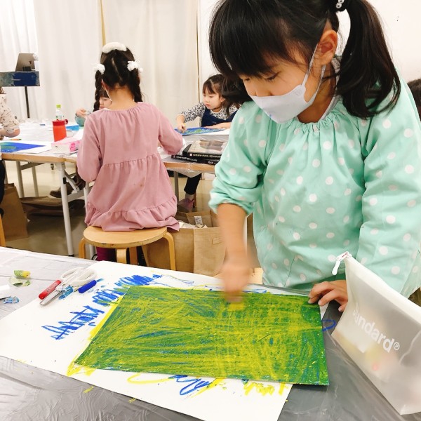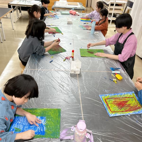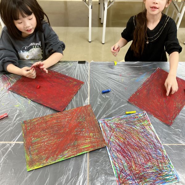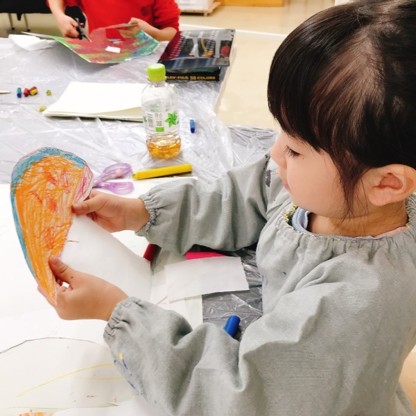 これだけ色を塗り込むと、いつもの画用紙がずっしり重たく感じるほど。力いっぱい塗り続けたこどもたちは、この重厚感が何よりもの達成感!油性のクレヨンならではの質感や、混色から生まれた微妙な色の変化がとても魅力的です。