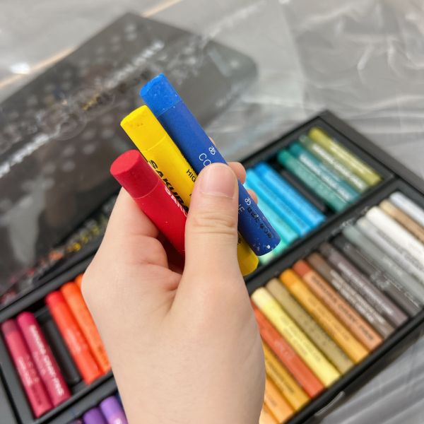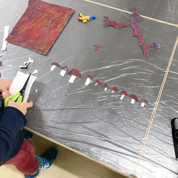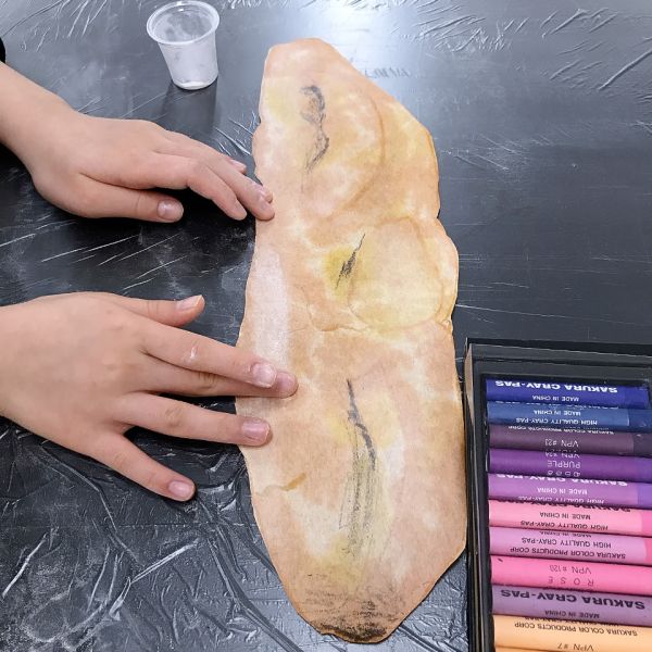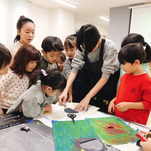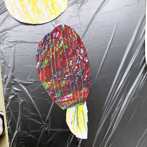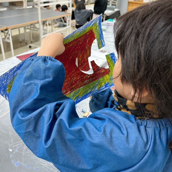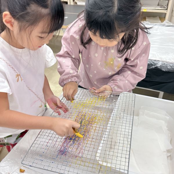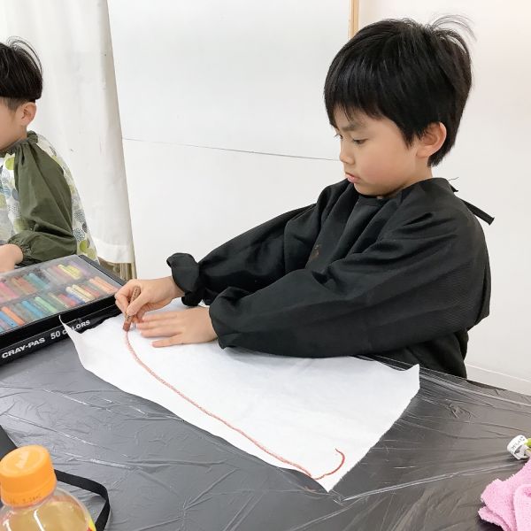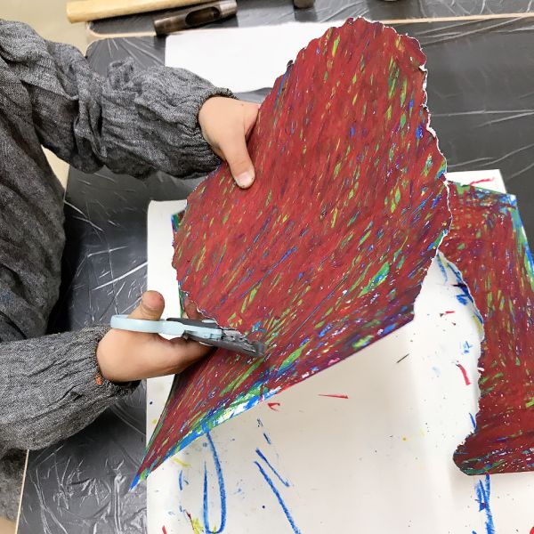 これだけ色を塗り込むと、いつもの画用紙がずっしり重たく感じるほど。力いっぱい塗り続けたこどもたちは、この重厚感が何よりもの達成感!油性のクレヨンならではの質感や、混色から生まれた微妙な色の変化がとても魅力的です。