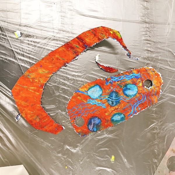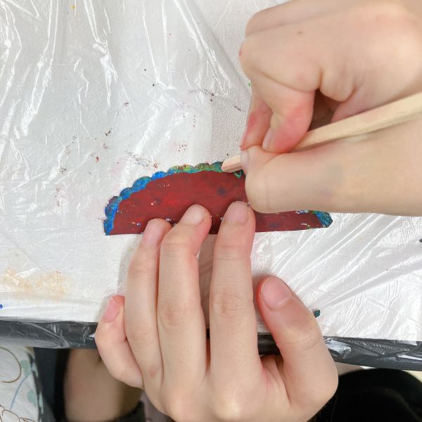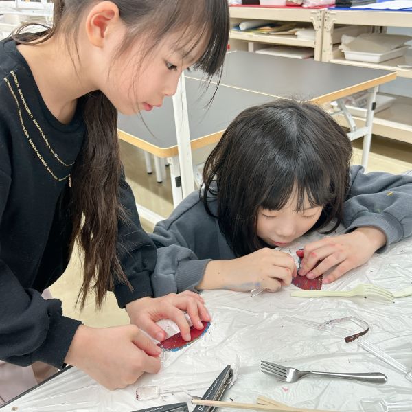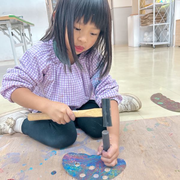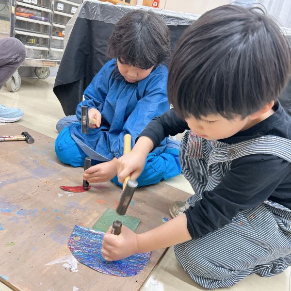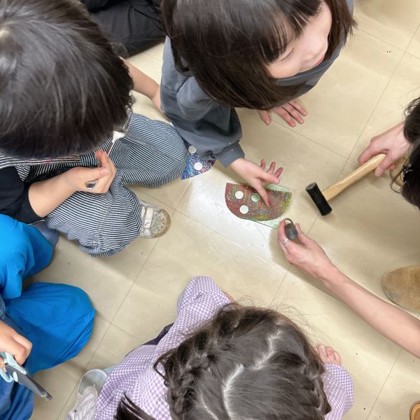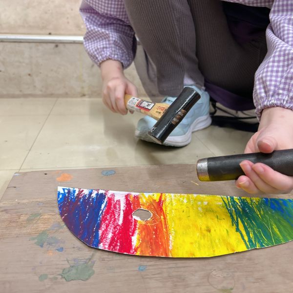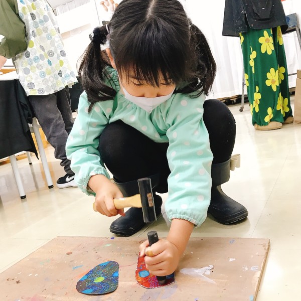 大きな丸い穴があく「ポンチ」がとにかく大人気!ゴム板の上に作品を乗せて、金槌でカンカン!力もコツもいるので、なかなか難しい道具なのですが「絶対やりたい」「もっともっと穴を開けたいんだ」と根気強く取り組む子が続出。