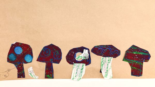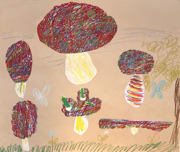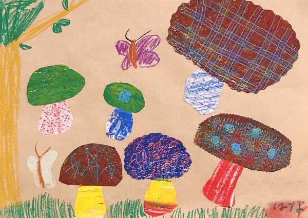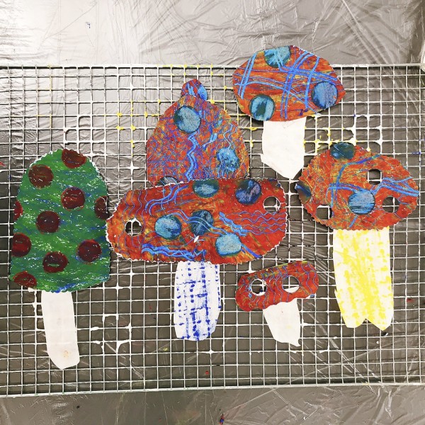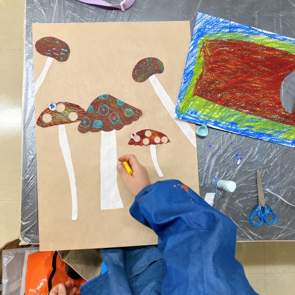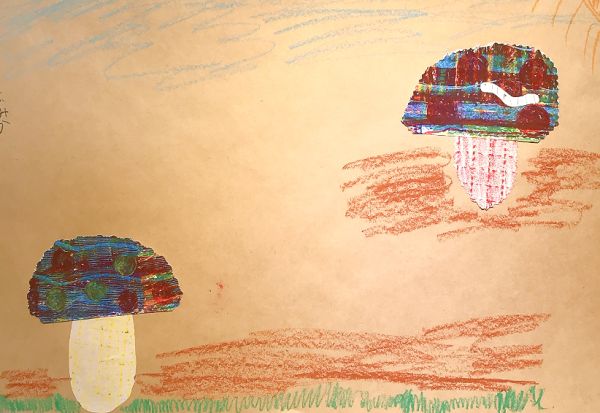 ゴリゴリゴリ…と、なんだかいい音が聞こえるぞ。見ると、凸凹の網目の上でフロッタージュして、模様を写している!これもまた、手応えが楽しい制作です。きのこの軸にも、いろいろ模様をつけたくなりますね。