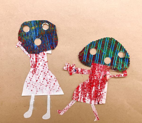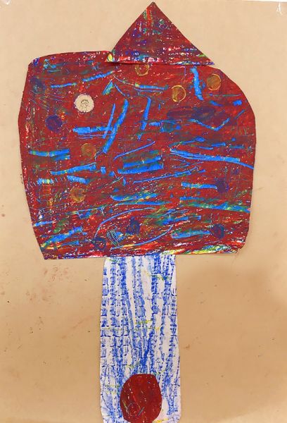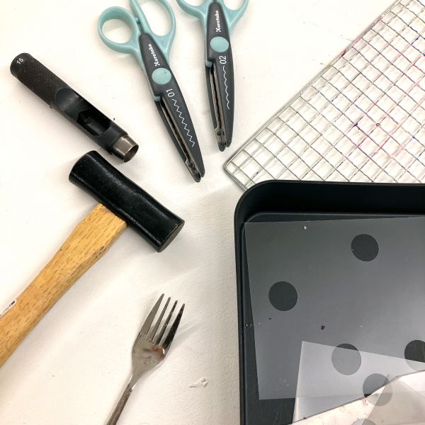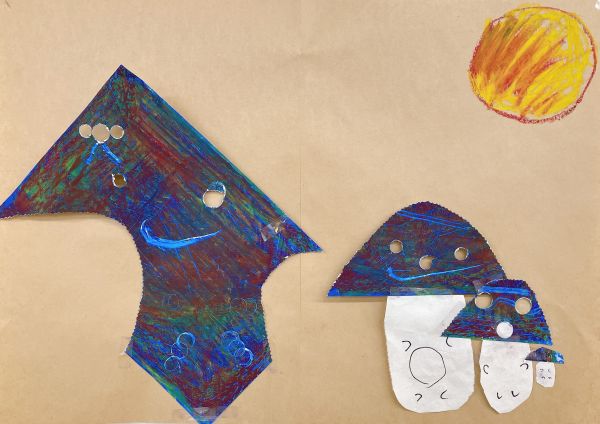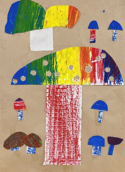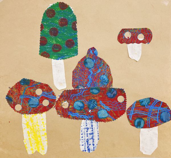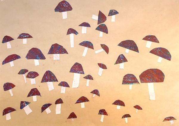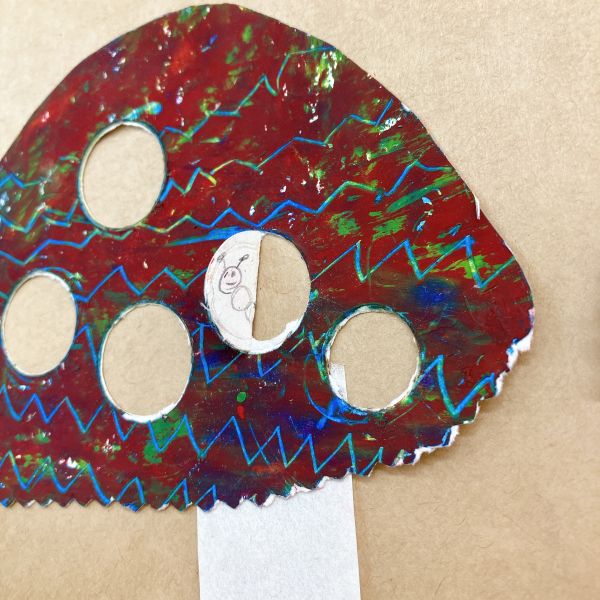 画面いっぱい茶色ができたところで「どんな姿のきのこにしよう?」まあるいきのこ、平べったいきのこ、模様があるきのこ、いろんな想像が膨らみます。ポンチ、金槌、ゴム板、ピンキングはさみ、金網、スプーン&フォーク、ステンシル型...道具がいっぱいだ!