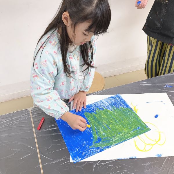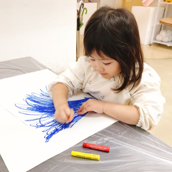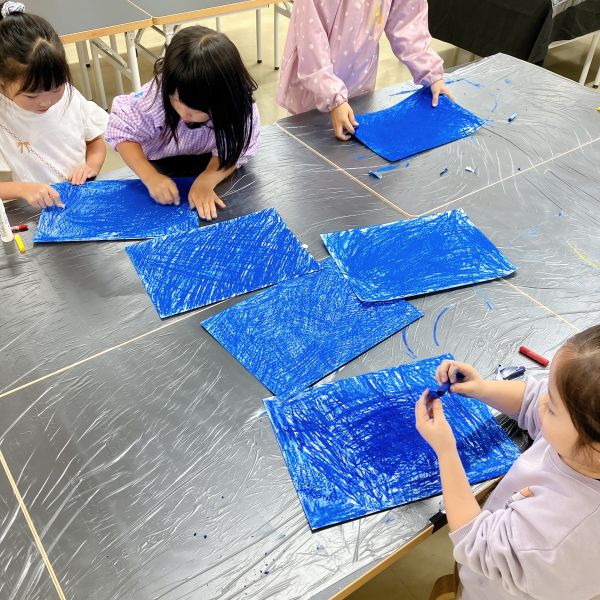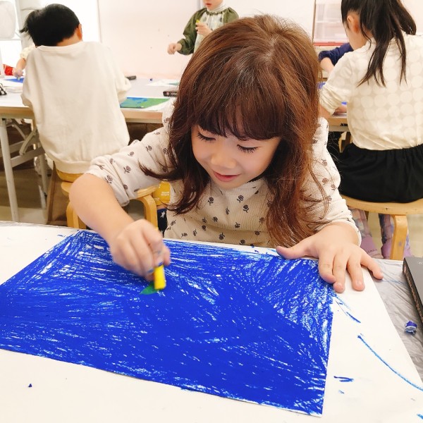 しばし教室にクレヨンを塗る力強い音が響きます。この手応えがおもしろいようで、小さい子でもぐいぐいと強い塗りつぶしができていました。すごい!青ってすごくきれいですね。「次はなんの色?」