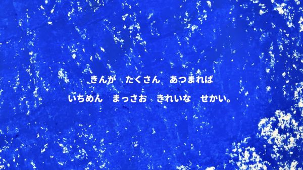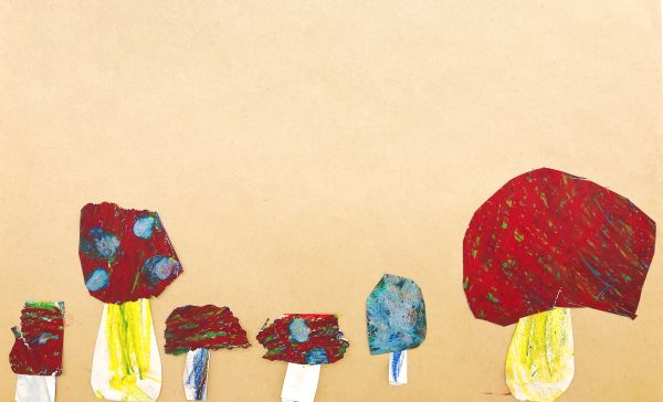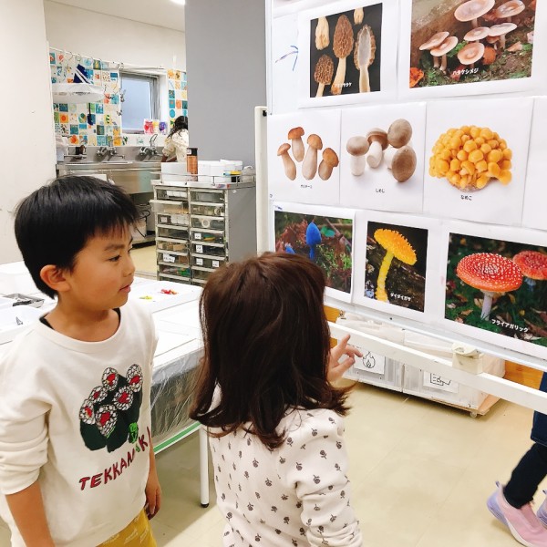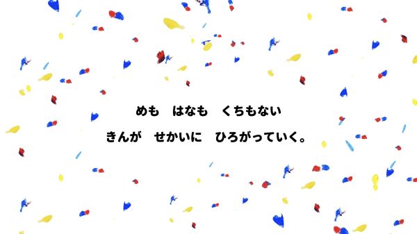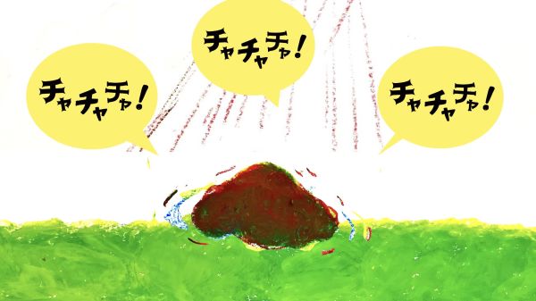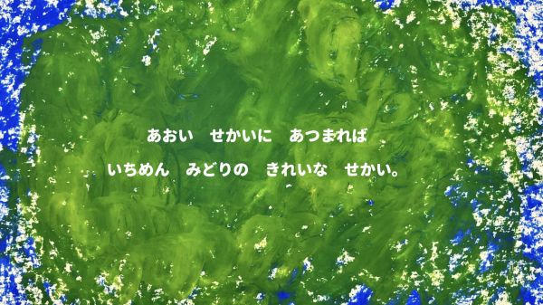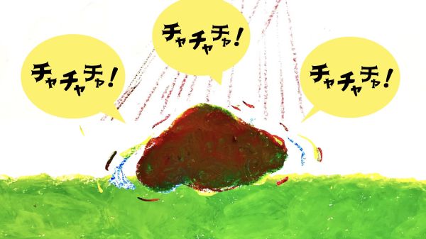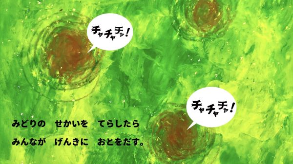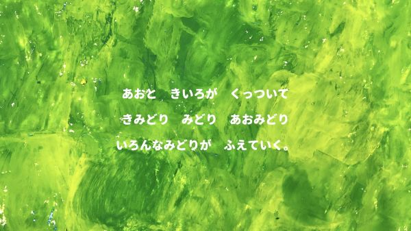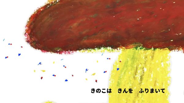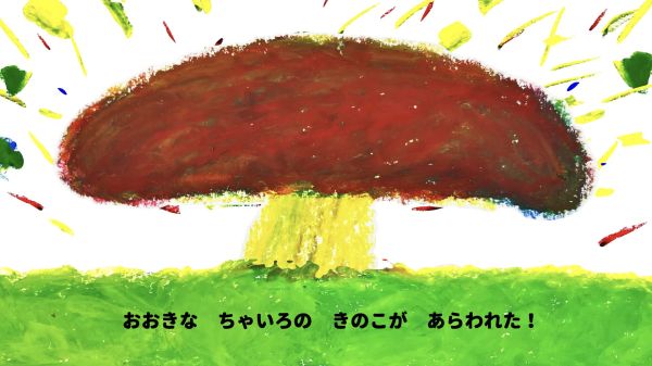なんと、主人公の最初の姿は「菌」です。青い菌、黄色い菌が空中で集まって、色がどんどん変化していきます。最後はりっぱなキノコに成長していきました。その色は、楽しそうな『チャチャチャ』!こどもたちも自分のクレヨン箱の中から青、黄、赤の3つの色を探して、「あったよ!」
