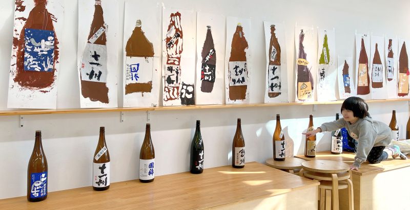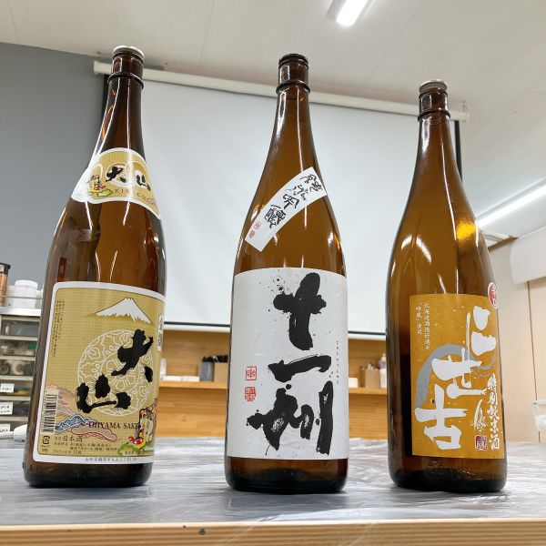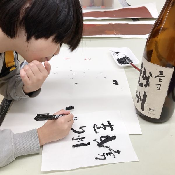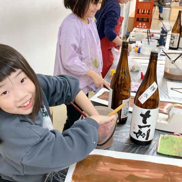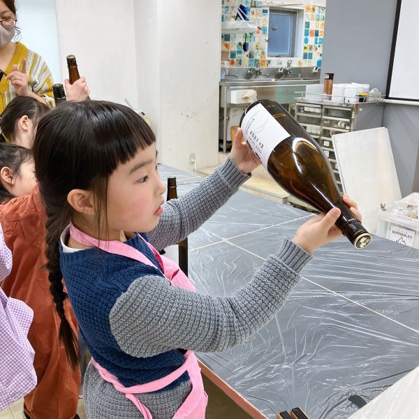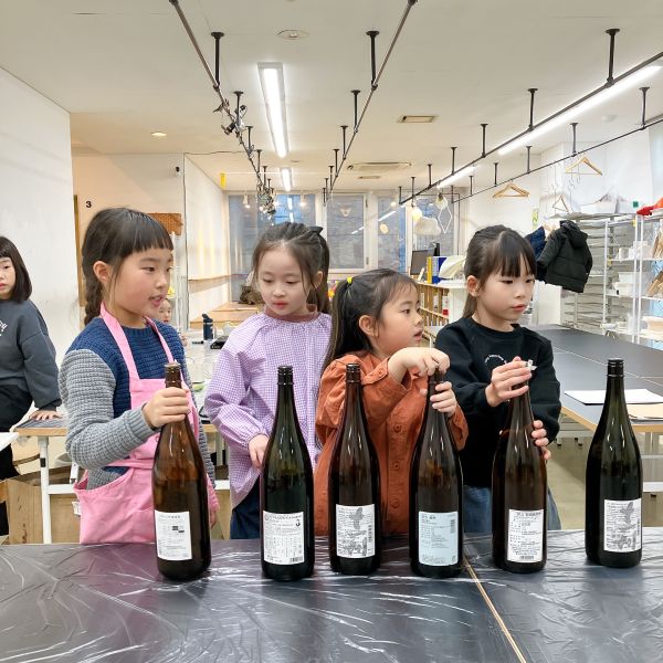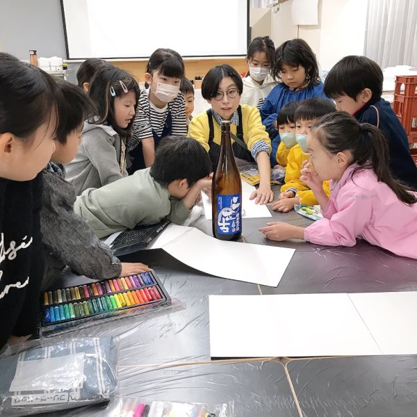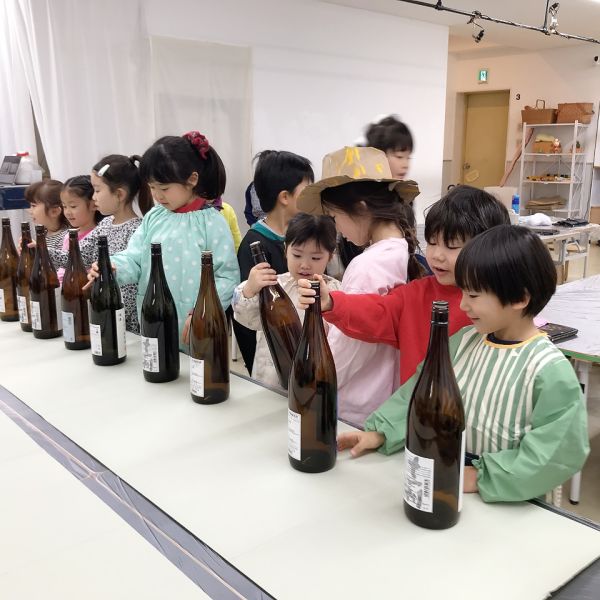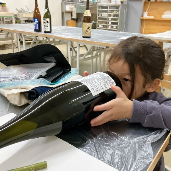 教室にどどーんと並ぶ一升瓶、もうこれだけで迫力がありますね。「おじいちゃんが飲んでた」「お店で見たことある」など、こどもたちにとってはあまり馴染みのない存在。実はこの瓶の色には理由があって、日の光から、中身のお酒の品質を守るため茶色にしているらしいですよ。