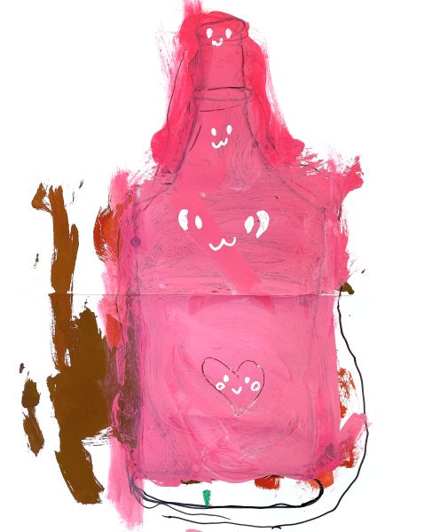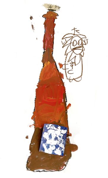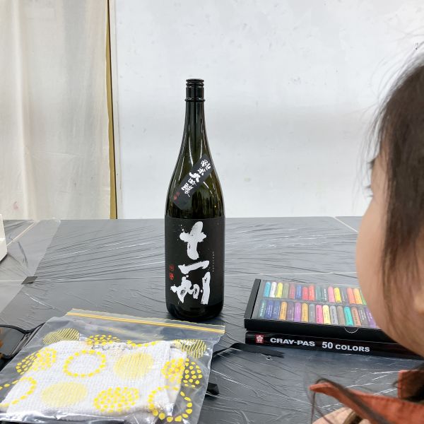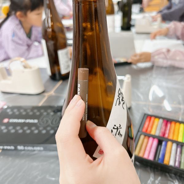 「なんかかっこいいのができたかも…」描けば描くほど、なんだかワクワクしてくる不思議な制作。さらに、お酒の名前ラベルの他にも小さなシールがあることを発見し、いつの間にか付け足されている!さっそく、描いたものをびんに貼ってみよう。