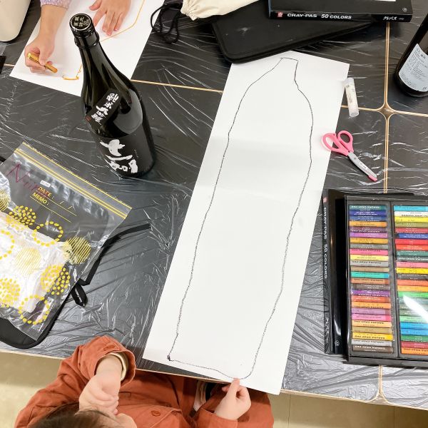 日本酒の瓶に貼り付けられたラベルは、みんなの絵でも別に作りました。それぞれ自分の瓶の太さに合わせて、ベースに使う紙をていねいにはさみでカット。