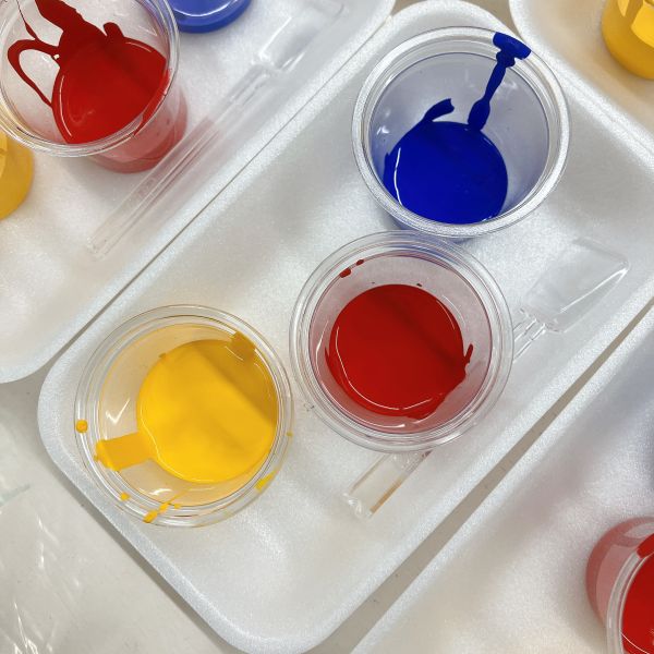 色の3原色の赤・青・黄。この3つの色を混ぜるだけで、さまざまな色が生まれます。この回のキッズコースは、トルネードオリジナルのおはなし『チャチャチャ』を軸に、混色を楽しんでいきます。
