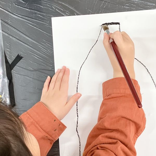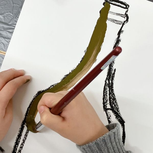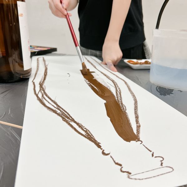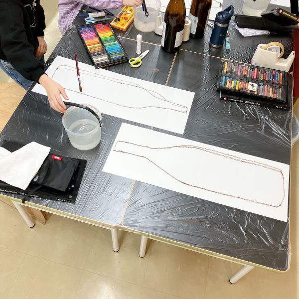 今回は瓶に合わせて、細長い紙に描いていきます。こどもたちの背に届きそうなくらいの長さ!びんの形を見てみると、「首」がにゅーんと伸びて、そこからまっすぐのボディ。のびやかな線で一気に描いていました。