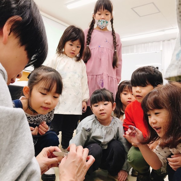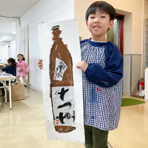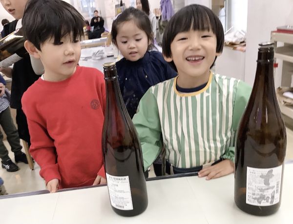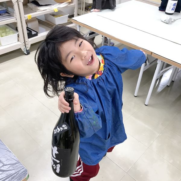 何かと「チャチャチャ♪」と歌って踊る、今月のキッズたち。あれ...何か手に持ってます?これは今回のモチーフ、日本酒の一升瓶!これを持って踊ると、まるで酔っぱらいみたいでおもしろい。
