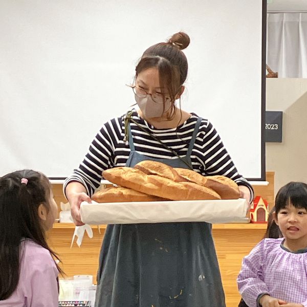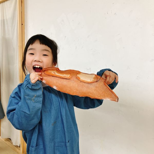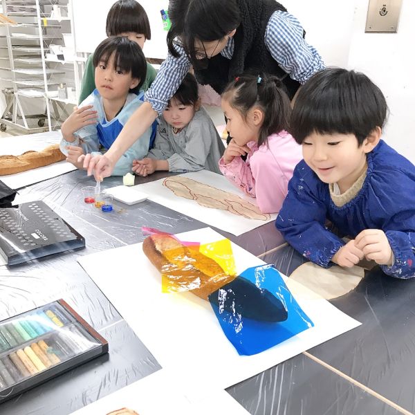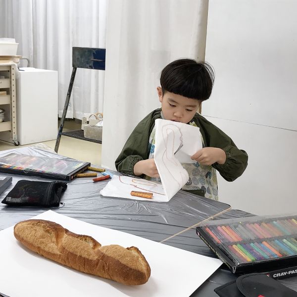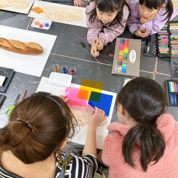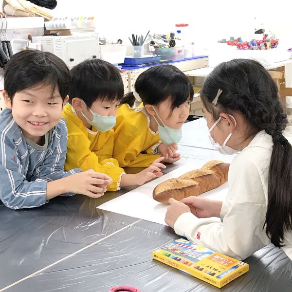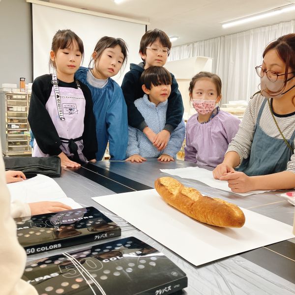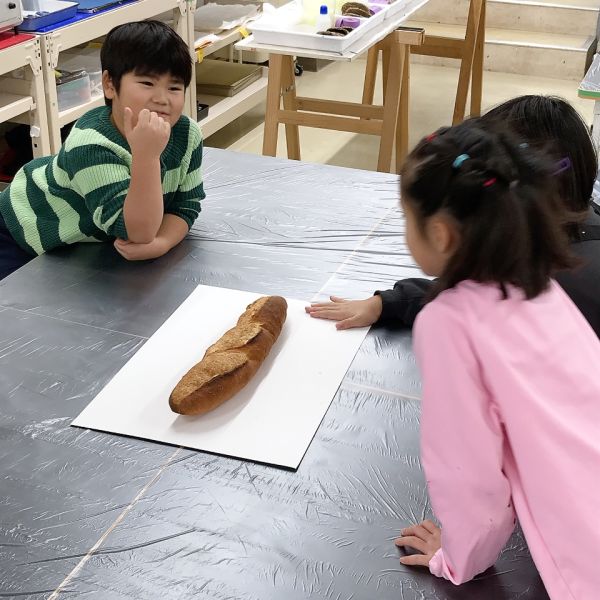 「あ、フランスパンだ!」「本物?」「食べれるの?」どうやらパン好きが多いキッズコース。今月のモチーフの中で、一番の盛り上がりでした。大事なモチーフなので触れないように、とは言っても、みんな近づいて「くんくん」「おいしそ〜う!」