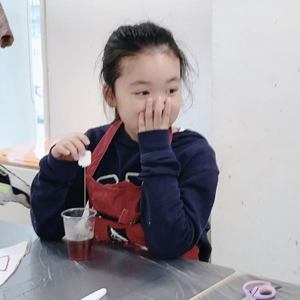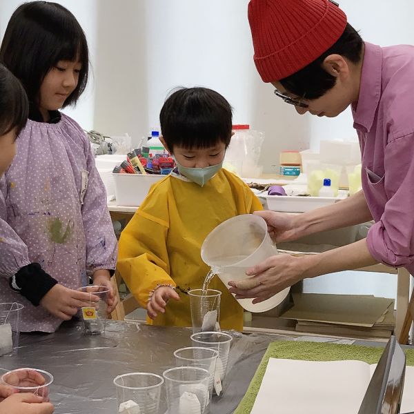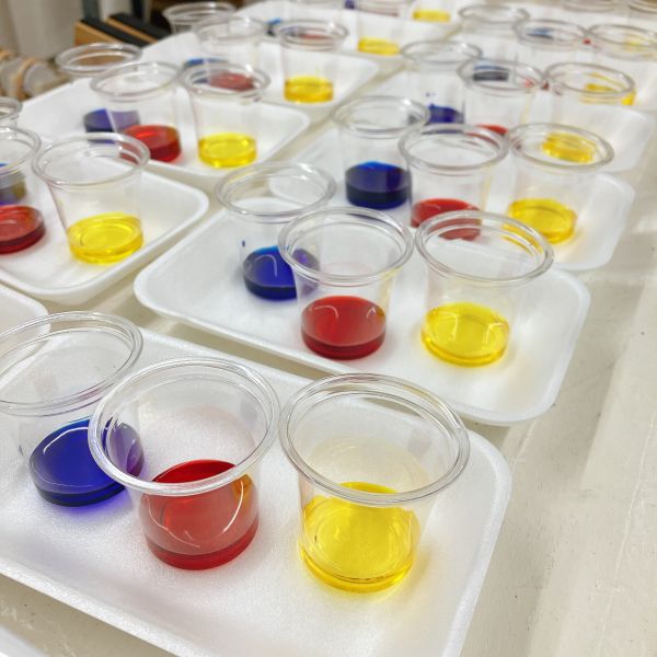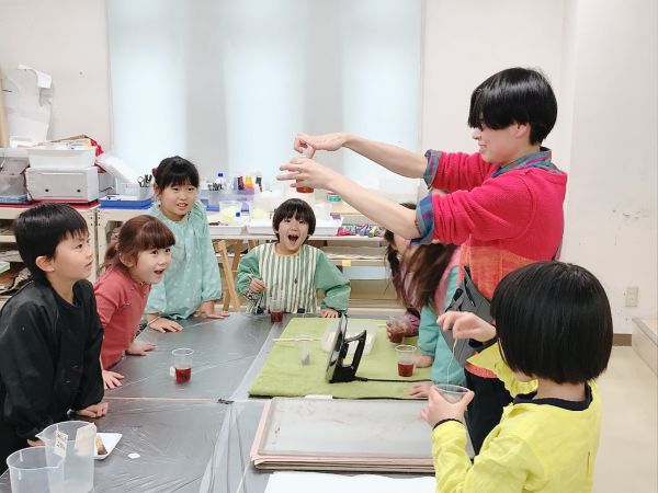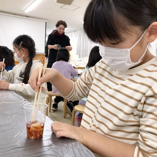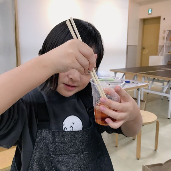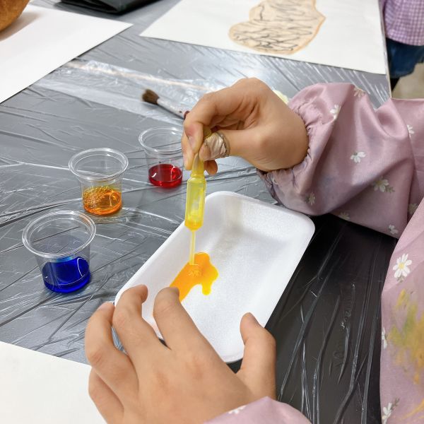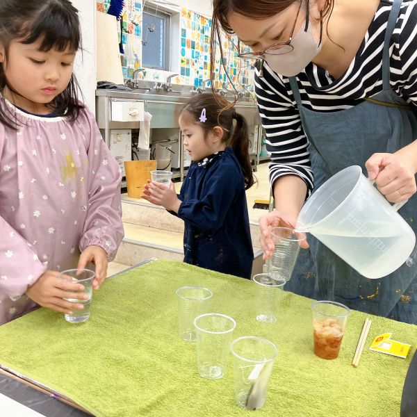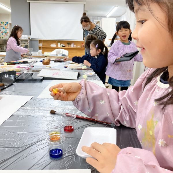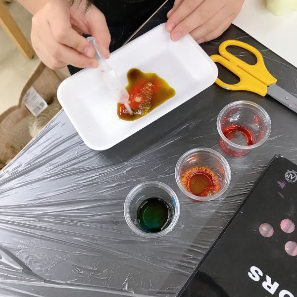 透明な液体ですが、色のパワーは強力。スポイトでほんの数滴落としてみるだけで、すぐに混色ができます。科学実験のような道具も登場して、みんなワクワク、うずうず。「早く試したい!」