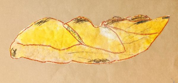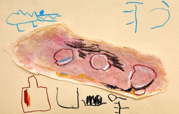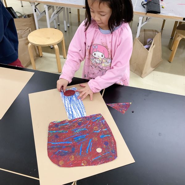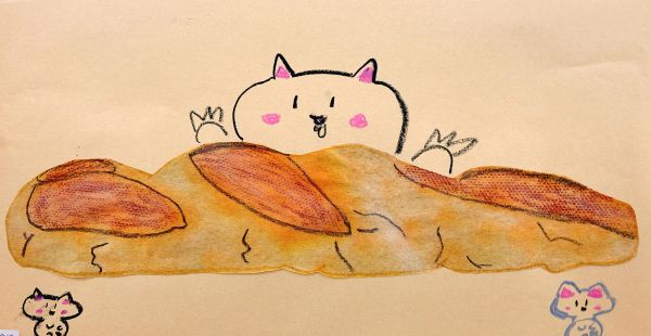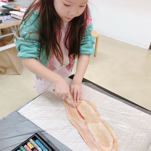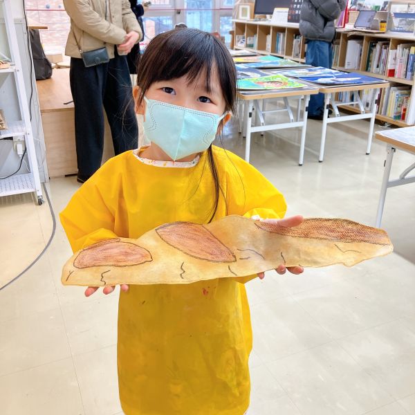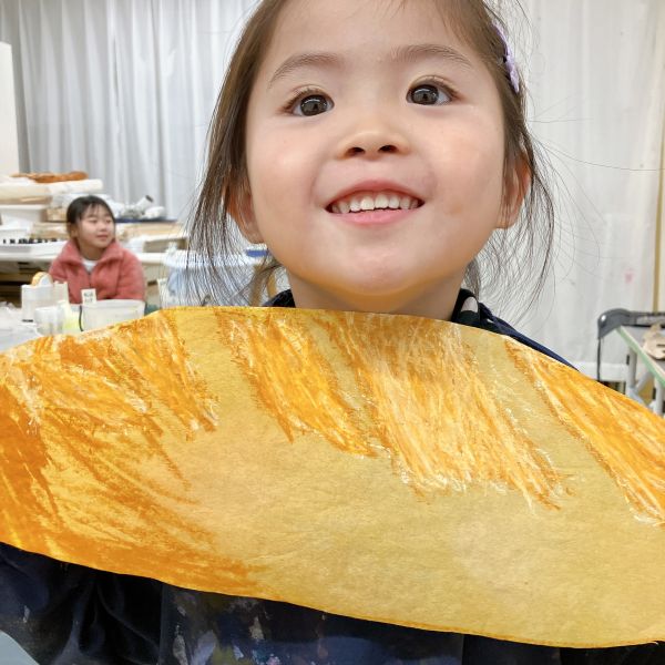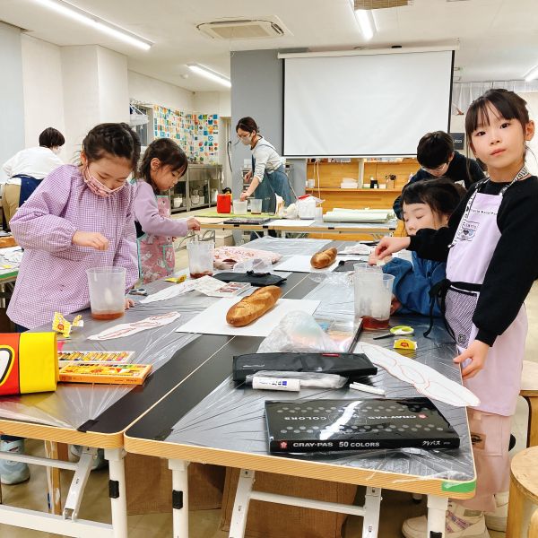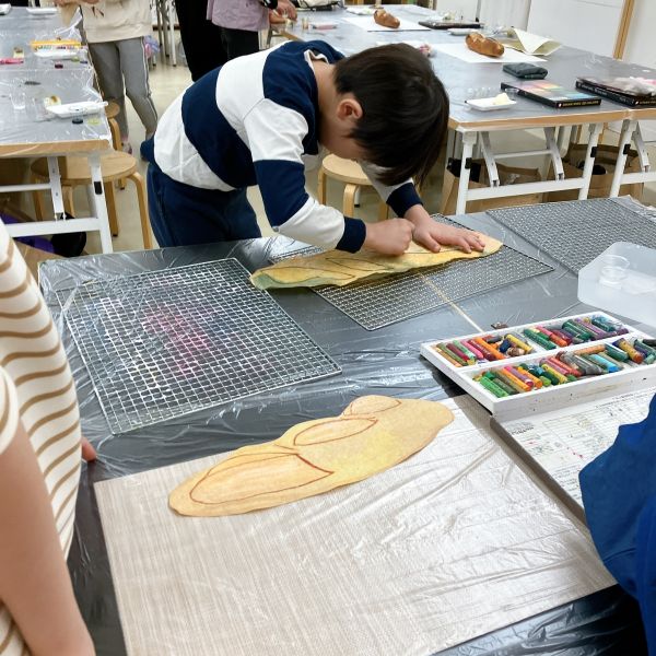 下に凸凹したシートや網目を敷いて、フロッタージュ。パンのつぶつぶ感や、焼き色で質感を表現していました。こちらはクレヨンの白も効いていて、さわるとふわふわしそう!ふっくらとした、すごくリアルな印象になってきました。みんな最後までこだわりのある表現をしていました。