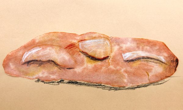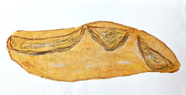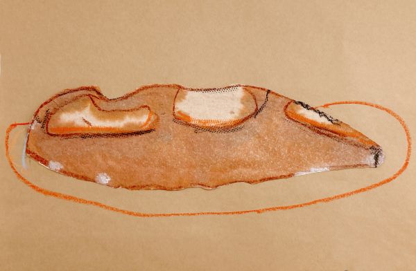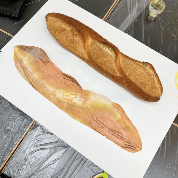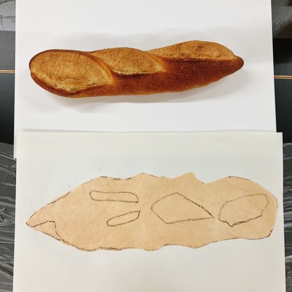 さっそくパンを描いていきます。細長い棒のような生地が、オーブンの中で熱をもって、ふわふわ、むくむくと膨らんでできた形をよくみてみよう。描きながらも、香ばしいにおいがたまらない。自然と大きく描いてしまうよね!