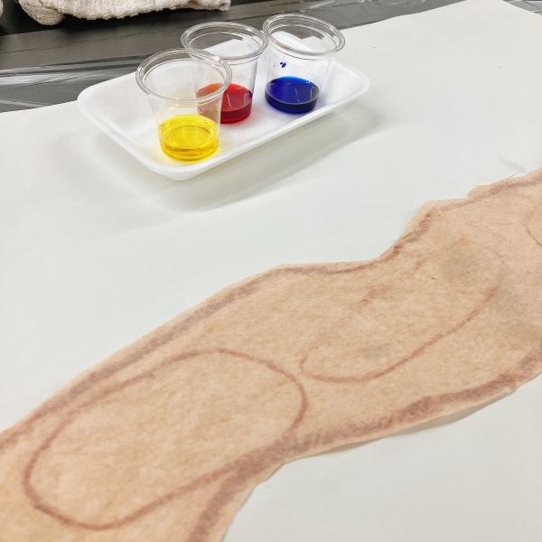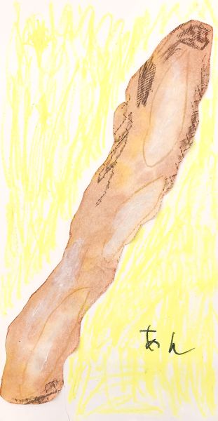 赤、青、黄の強弱で、さまざまな茶色が生まれるはず。色のバランスを調整しながら、パンの色作りです。どんな茶色ができるかな?紅茶でしっとりとしたパンの絵に、このインクを垂らすと…