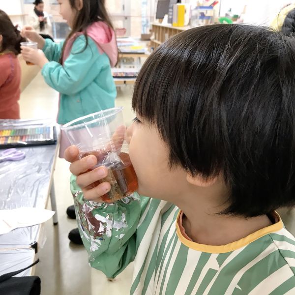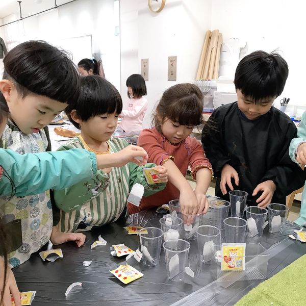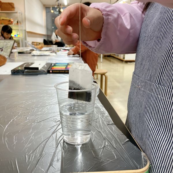 パンの形が出来上がったところで、突然ティータイム。「えっ?」「お茶飲むの?」いえいえ、今回はこの紅茶の色に注目。それぞれカップとお湯、ティーバッグをもらって、できるだけ濃い紅茶を作ってみてください。お湯にティーバッグを浸すと、よい匂いがふんわり。