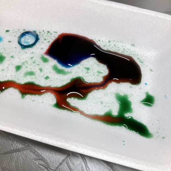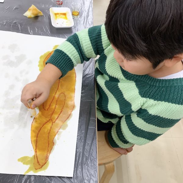 絵の具等とのちがいは、水のようにサラサラとして、透明なこと。カラーセロファンのように下の色を透かします。インクの美しさに、こどもたちは一瞬で惹きつけられました。前回と同じく赤・青・黄の三原色だけですが、これでたくさんの色ができることをこどもたちは知っています。