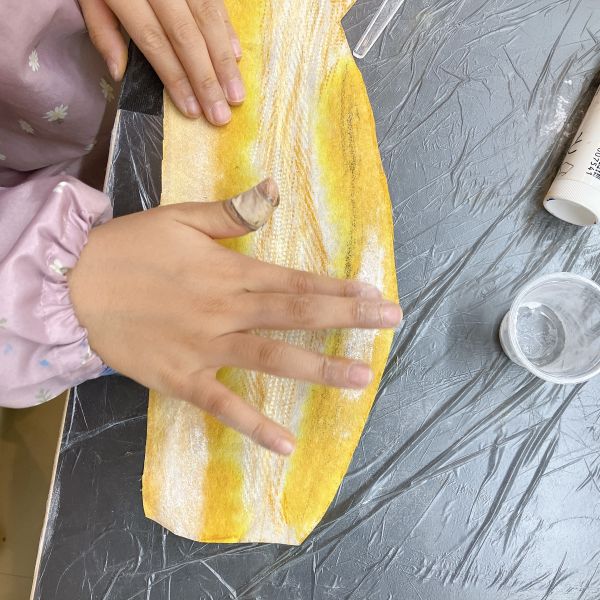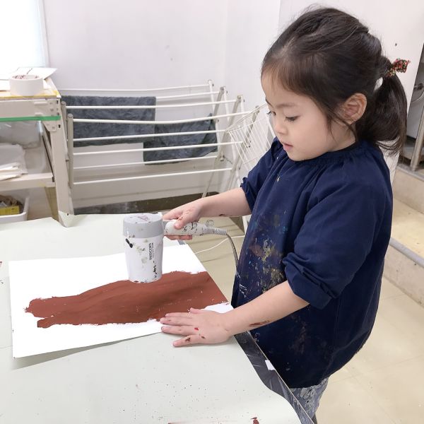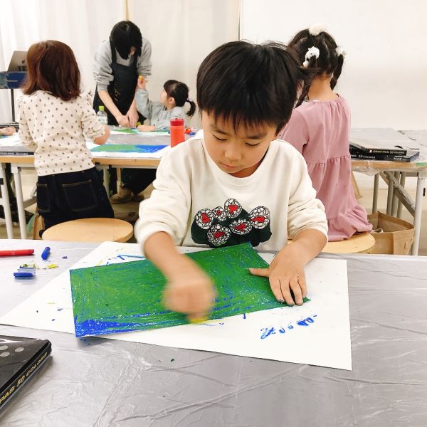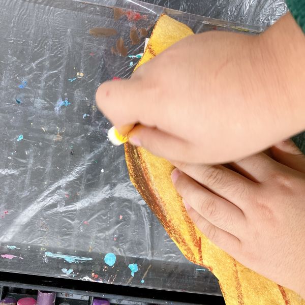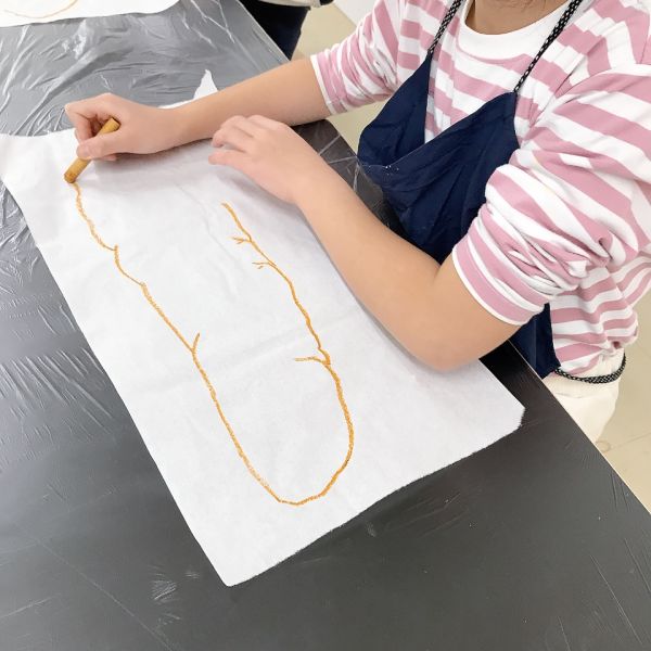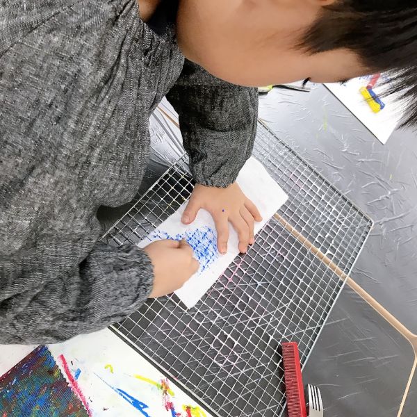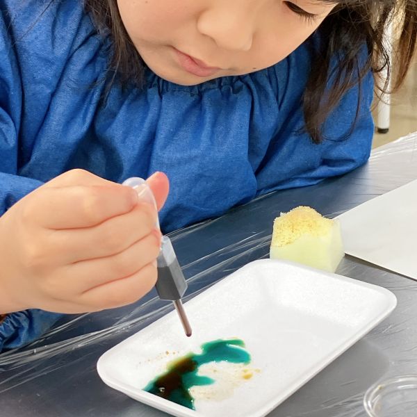 インクののせ方にも一工夫。筆にたっぷりとつけて塗り広げたり、スポイトでチョンチョンと部分的に垂らしてみたり、スポンジを使ってカサカサと、かすかに色が感じられるように工夫している子も。