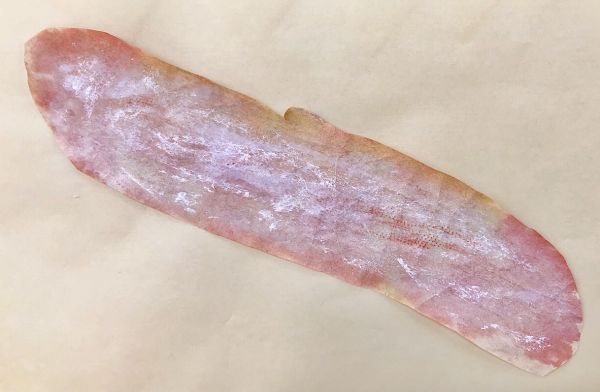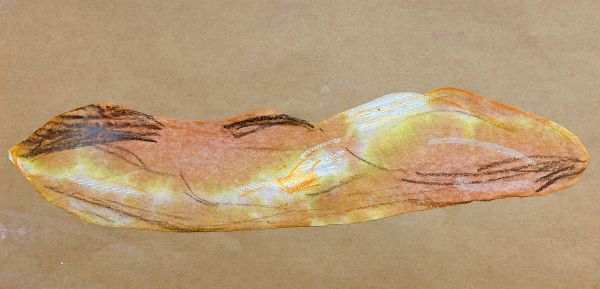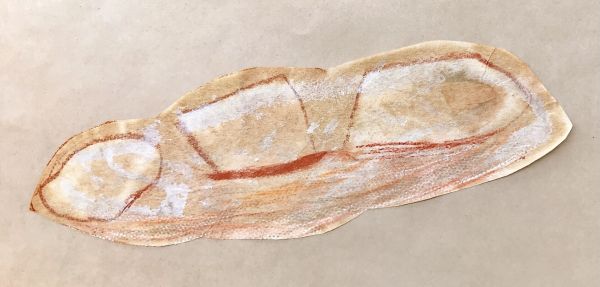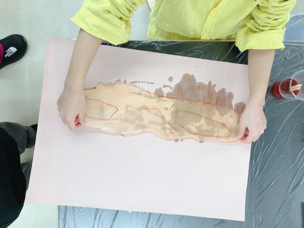はさみで切り抜いてみると「おおー、オレのパン!」「でっかい!」細長い和紙に、カリッと焼けた部分や、ふんわりふくらんだ部分がよく描けています。「早くいい色にしたい!」