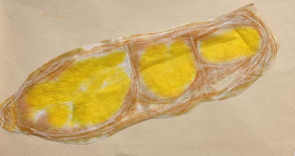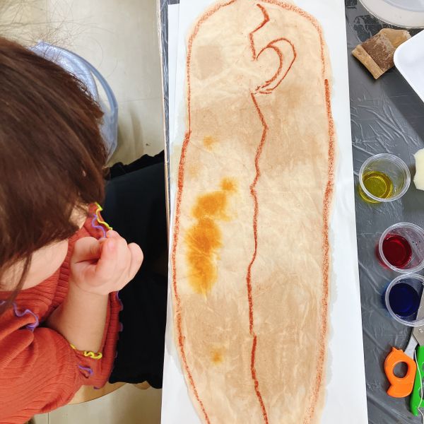 「もっと濃く?」「なんか、赤っぽくなってきたよ!」そうそう、紅茶の「紅」は、赤い色。自分のパンの絵を皺皺に丸めて、紅茶色に染めてみます。「フランスパンがお茶のお風呂に!」「あ!チャチャチャになってきたよ」「だんだん濃くなる!」「そうか、パンの色になるんだ!」