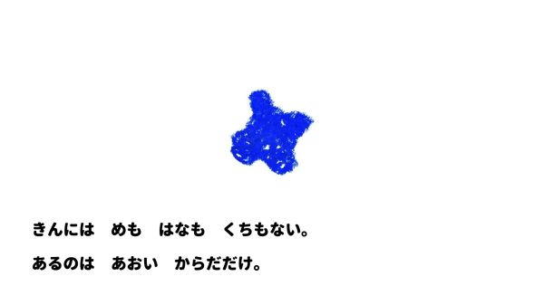 「きんには めも はなも くちもない。あるのは あおい からだだけ。」そんな青い菌が集まる様子。さっそくこどもたちも描きたい、描きたい!真っ白い画面に、勢いよく青が広がっていきます。