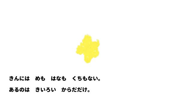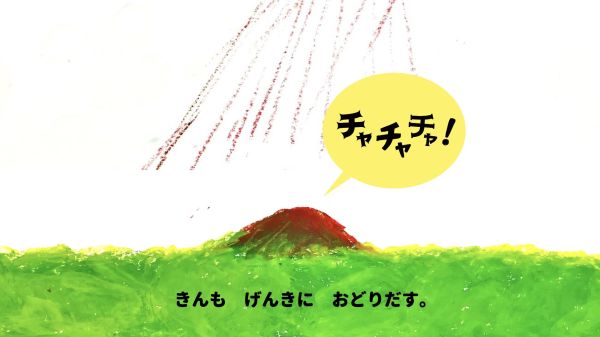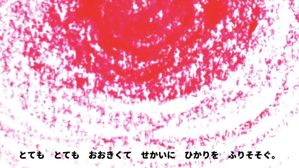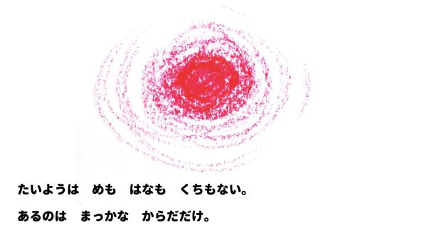 でも画面が大きいと、小さなこどもたちにはなかなかの体力仕事。「あ〜!たいへん!」そんな声も聞こえますが、顔を見ると何だか楽しそう。お話の途中で真っ赤な太陽が登場し、こどもたちの画面にも大きな変化が訪れます。赤いクレヨンを塗ってみたところ...「この色は!?」