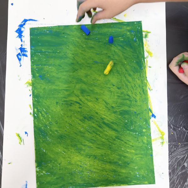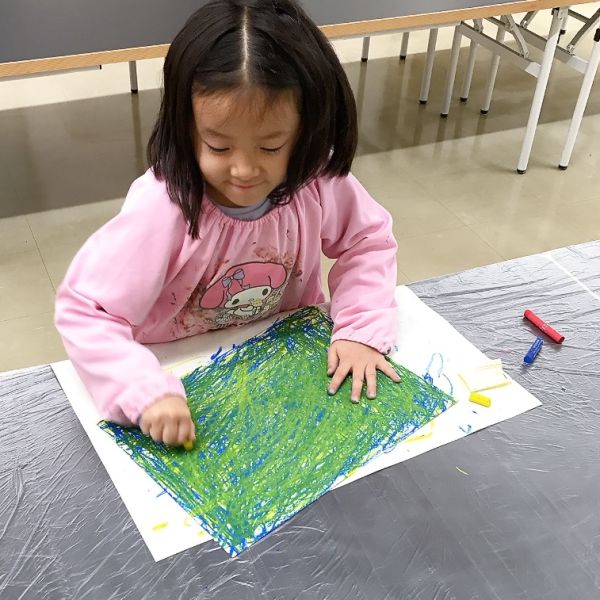 「早く塗りたい!」と勢いづいたこどもたちが、黄色のクレヨンを上から塗り始めました。「わあ!きれい!」「めっちゃみどりだ!」絵の具の混色はよく体験していますが、クレヨンでもしっかり塗り込むと、こんなにきれいな混色ができるんです。
