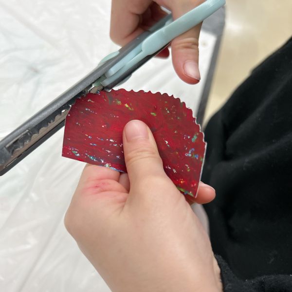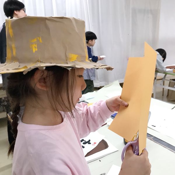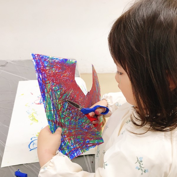 まずは、お好みの形に切り抜いて。ここでさっそく、ピンキングばさみを使う子が登場。ギザギザしたり、モコモコしたり。「うわ、かわいい!」「いいかも」と周りのこどもたちも挑戦していました。