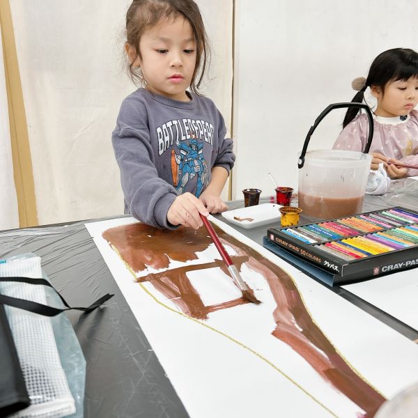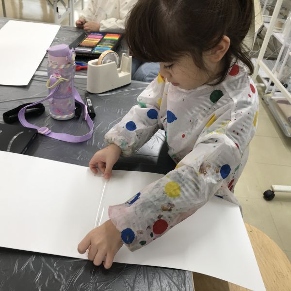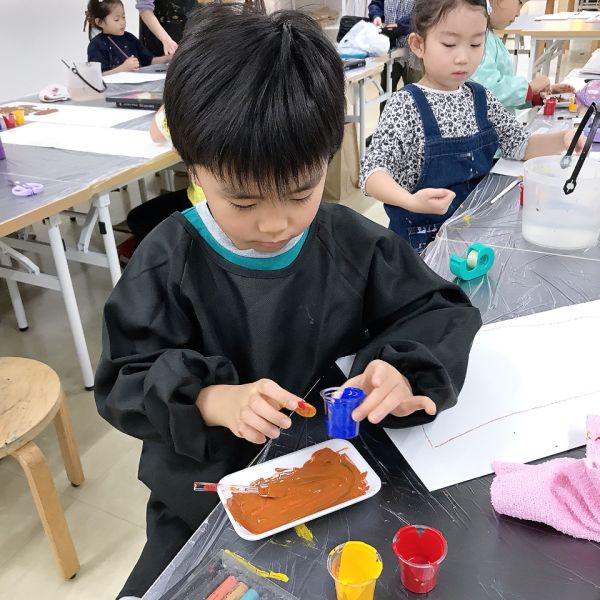 絵の具の混色は慣れてきたキッズのこどもたち。前回クレヨンでも青、黄、赤の混色を経験しているので、茶色ができそう!とすぐにピンときていました。「できるだけ暗い茶色を作るにはどうしたらいいかな?」という問いかけにも、なんだか自信がありそうです。