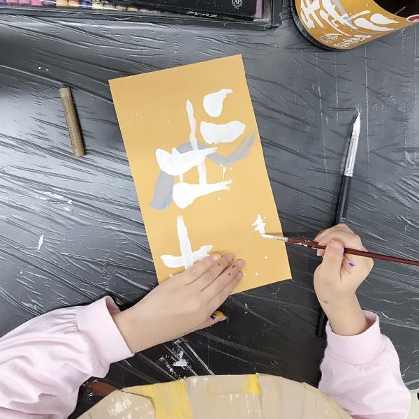 大きな文字以外にも、細かな文字や落款(ハンコ)などまで、さらに細部を似せようと工夫する子も。描く部分に合わせて、ペンやクレヨンなど他の画材も使いながらそれぞれで取り組んでいました。