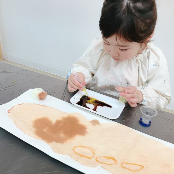 この月は、茶色をテーマにいろんな混色実験を展開していますが、「何か足りないと思ったら、赤だったんだ!」「最後に青を入れたら、すごく暗い色になったよ!」など、自分の欲しい色が作れた時は、格別にうれしそう。それぞれのタイミングで、色の発見を重ねているようです。