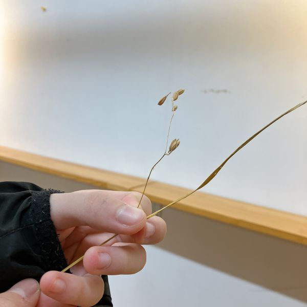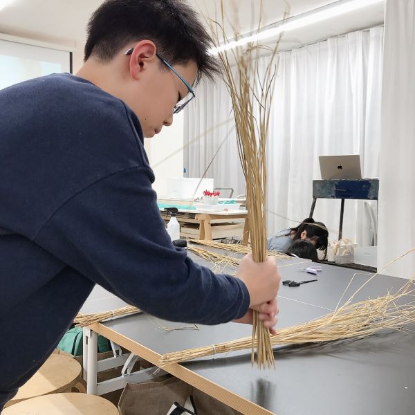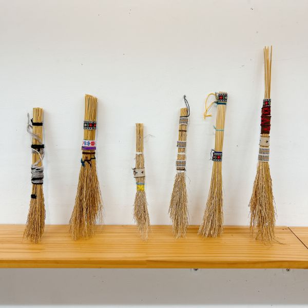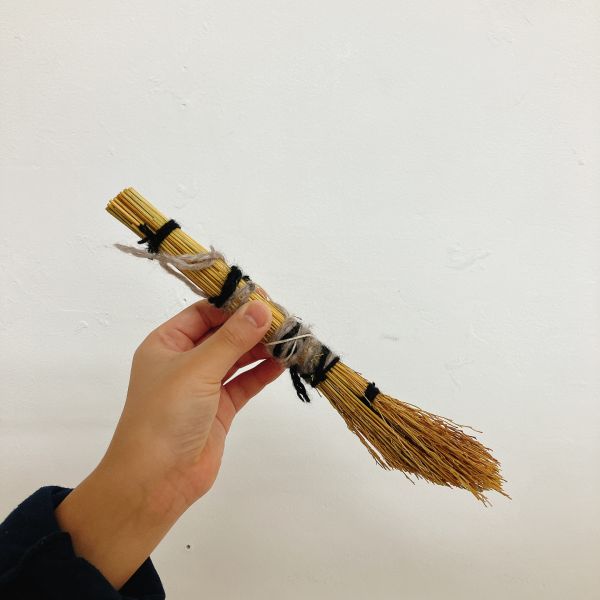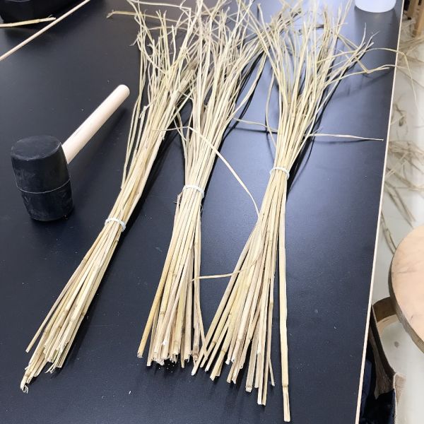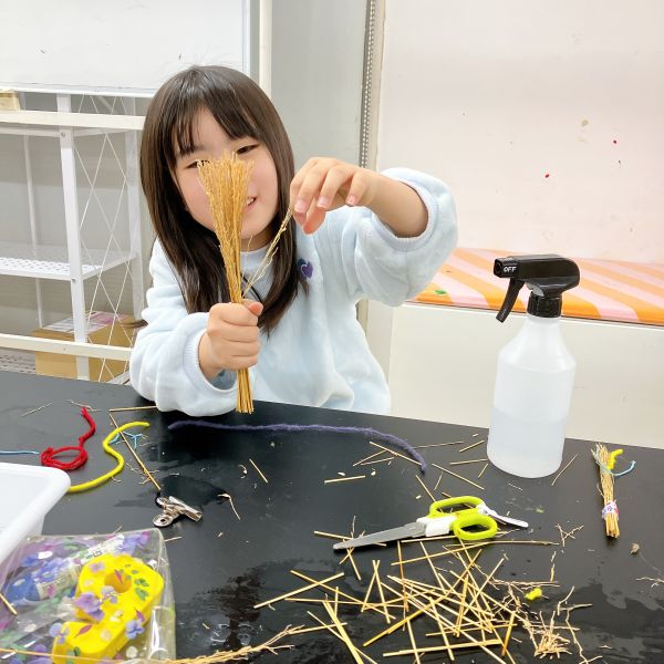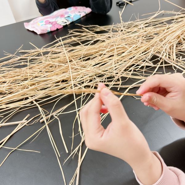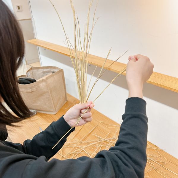 さあ、素材が集まったところで、ここからそれぞれのほうきづくりが始まります。試しに軽くまとめてみると...たしかにほうきになりそうな感じがしました。わらのコシが、ほうきにちょうど良さそうで、「持っただけで、もう使えるよ!」なんて声も。