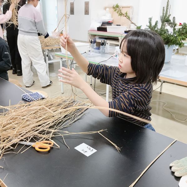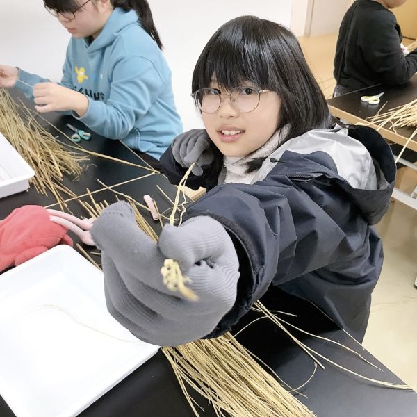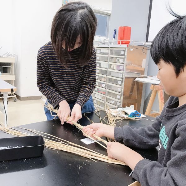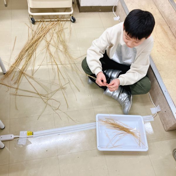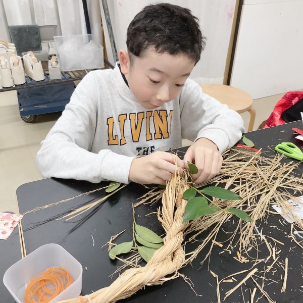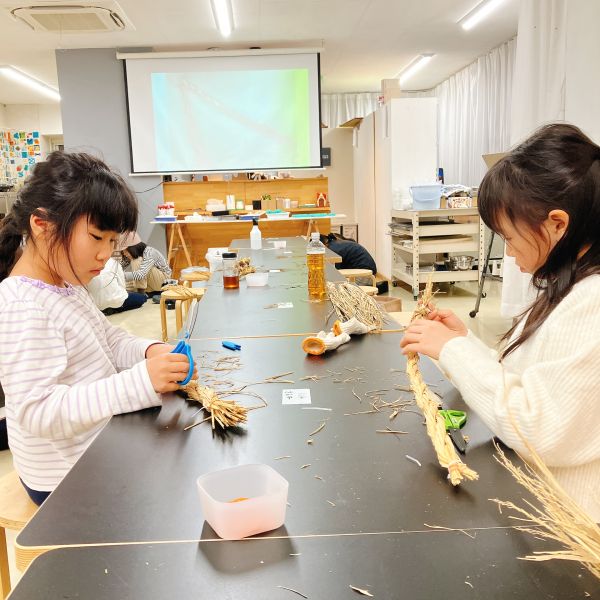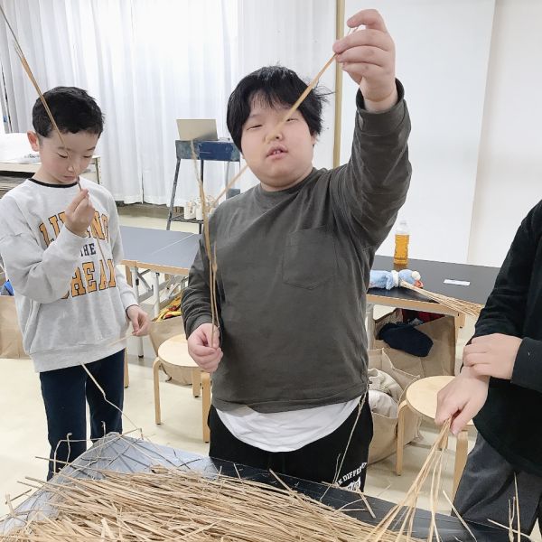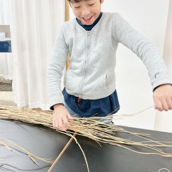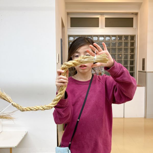 ここからはこどもたちのアイデアが存分に活かせる制作の後半です。まっすぐなしめ縄もあれば、くるっと丸めて輪っかの形など、いろんなデザインがありますね。何か動物の形にしたい!という子は、なわの形をぐいぐい変形させながら考え始めました。