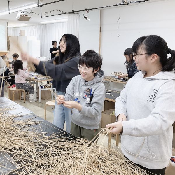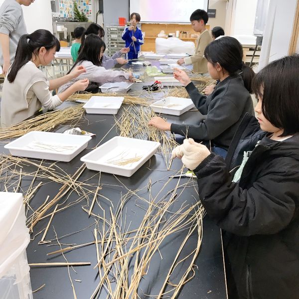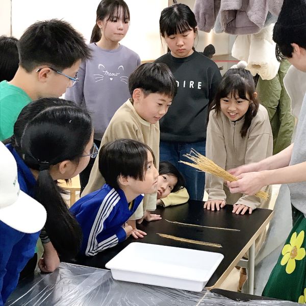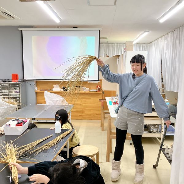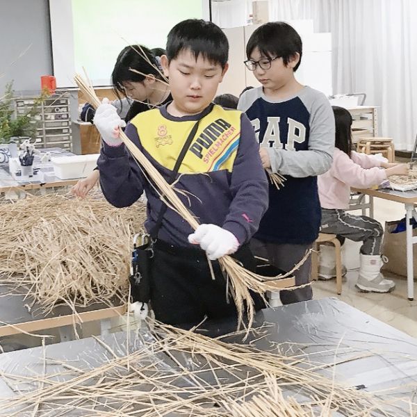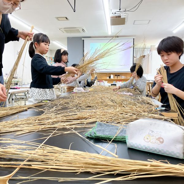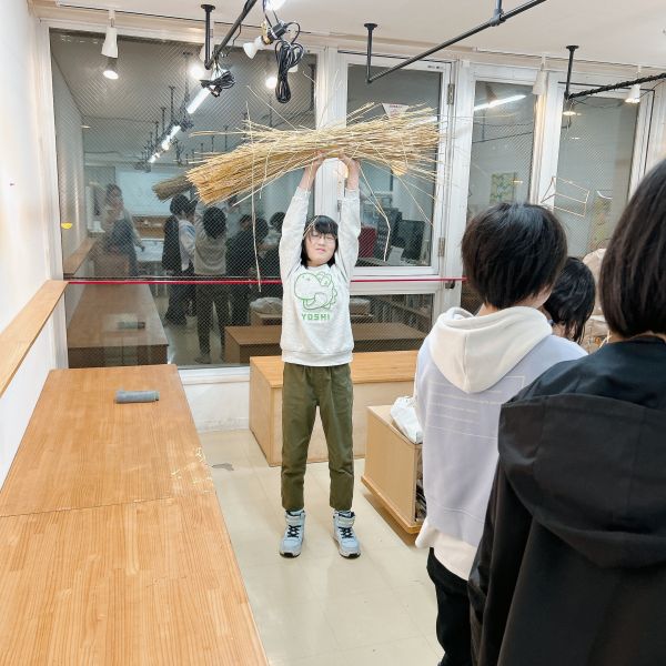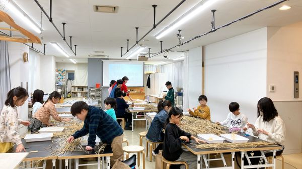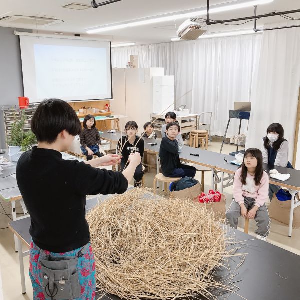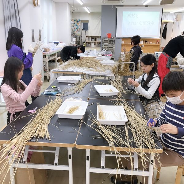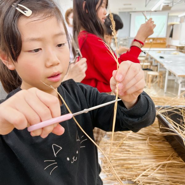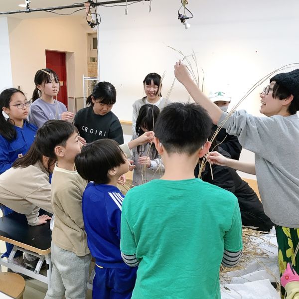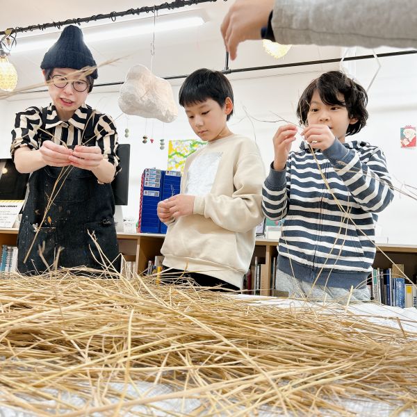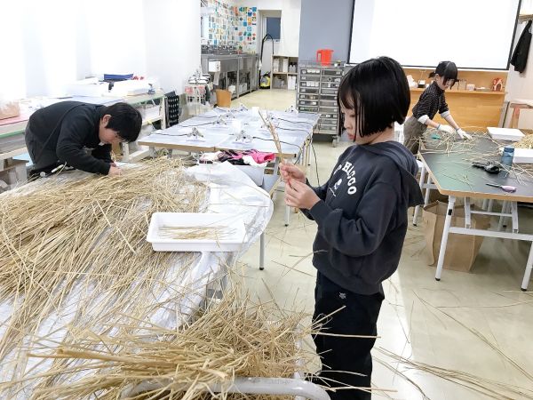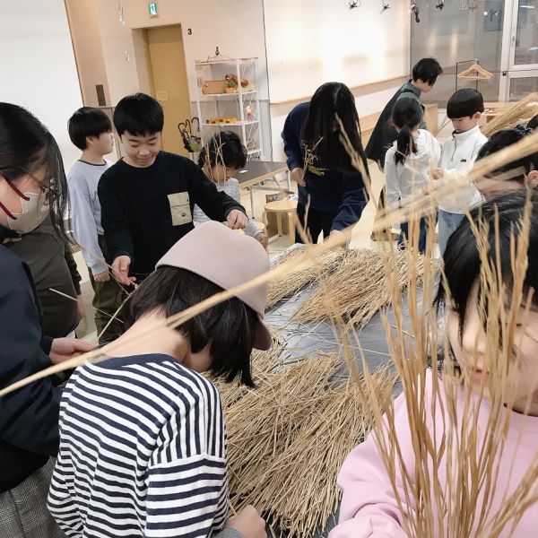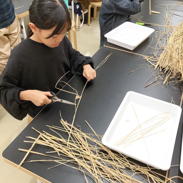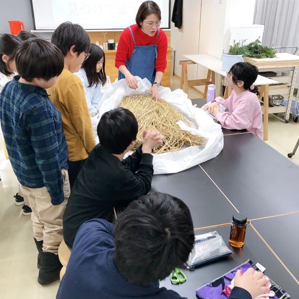 このプログラムのために、米農家さんから「稲わら」をたっぷり送ってもらいました。初めて触れる子も多いようで、山盛りの稲わらに興味津々。これが家の屋根になったり、農地の土壌改良材に使われたり、家畜の飼料になったり、畳や縄にもなるんですよ。