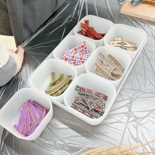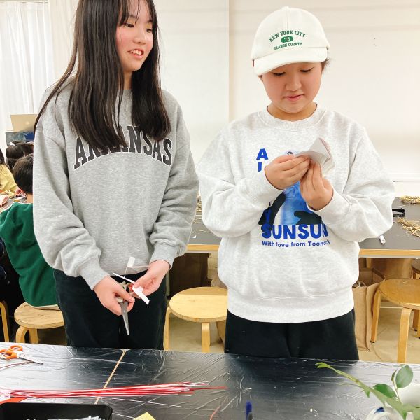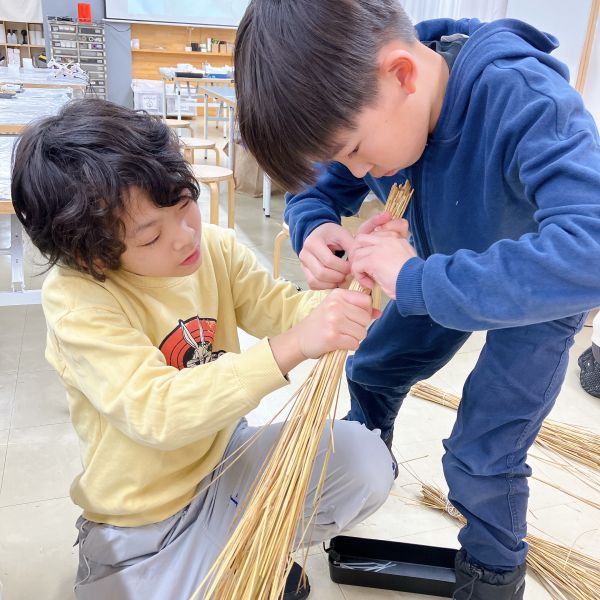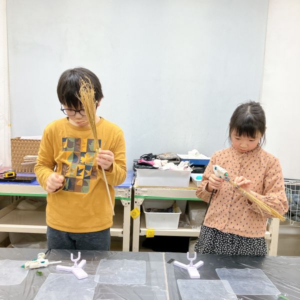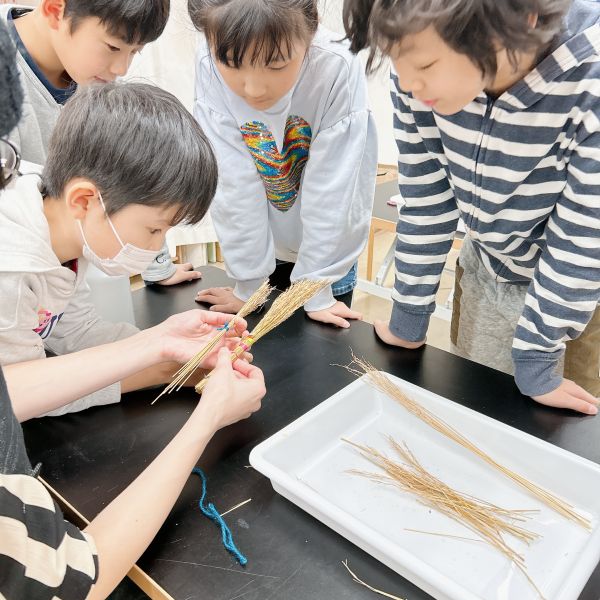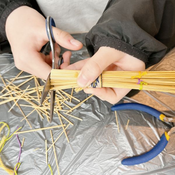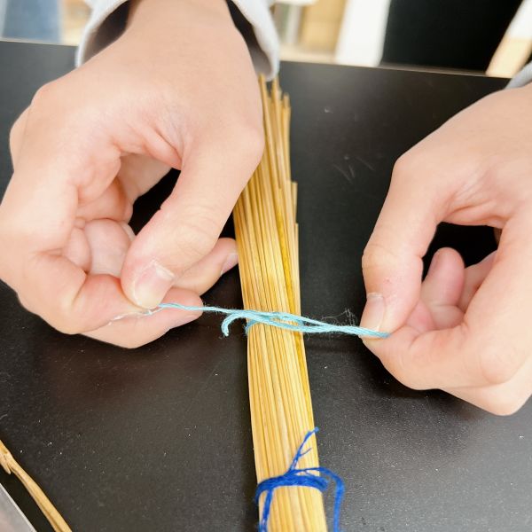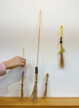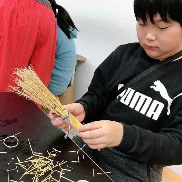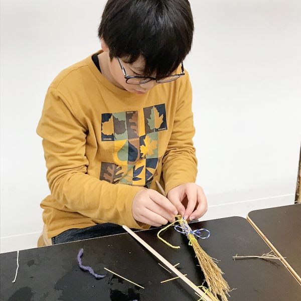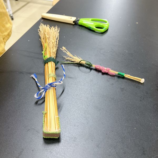 みんな好きな色のひもを選んでチャレンジしました。「持ち手」と「履く部分」をそれぞれひもで締めながら、ほうきの形にしていきます。サンプルのほうきや資料をみながら、どんな形のほうきにするのかを考えるのも楽しい様子。ちゃんとおそうじに使えるほうきにしたいですね!