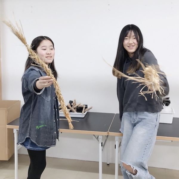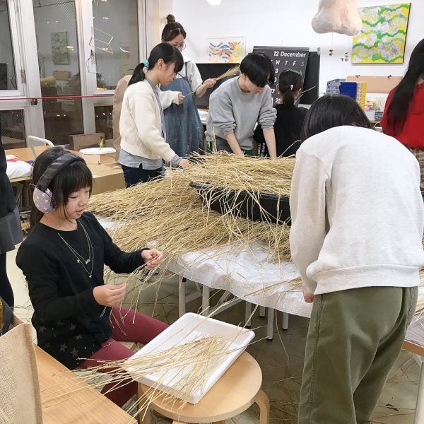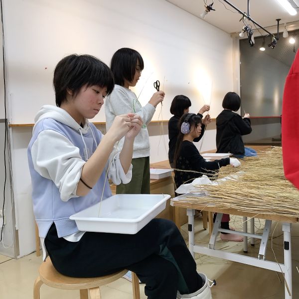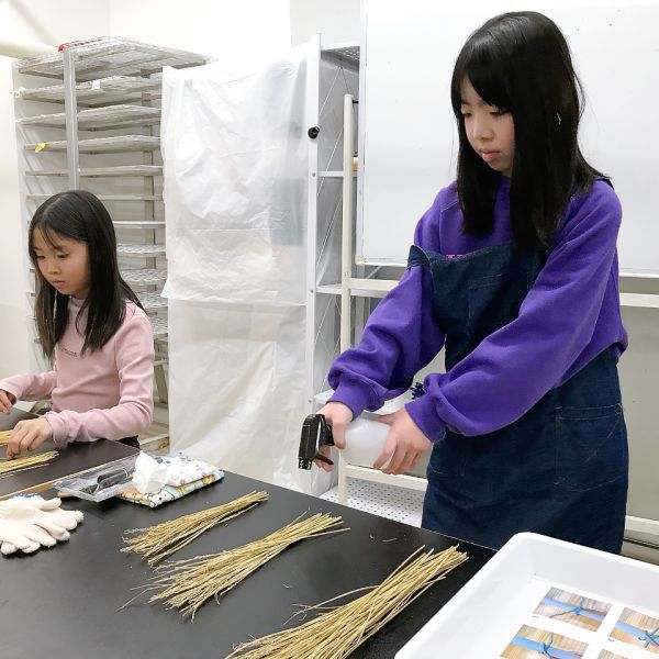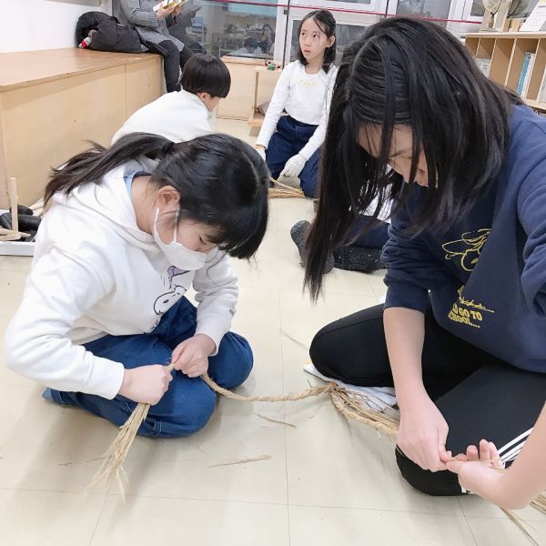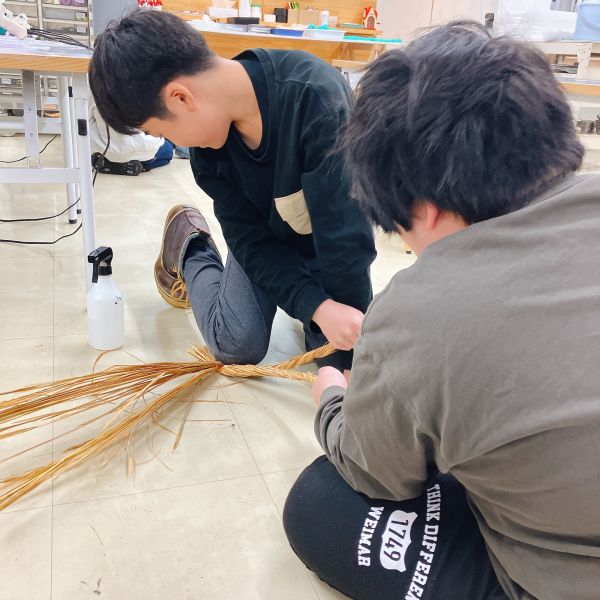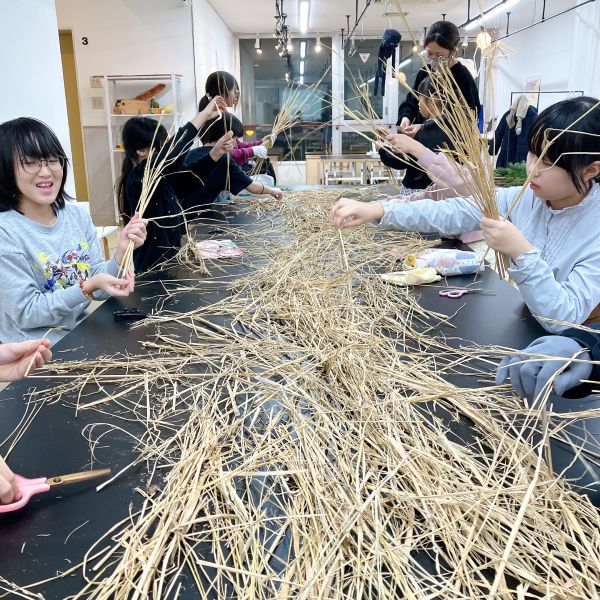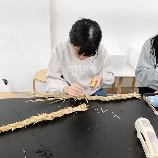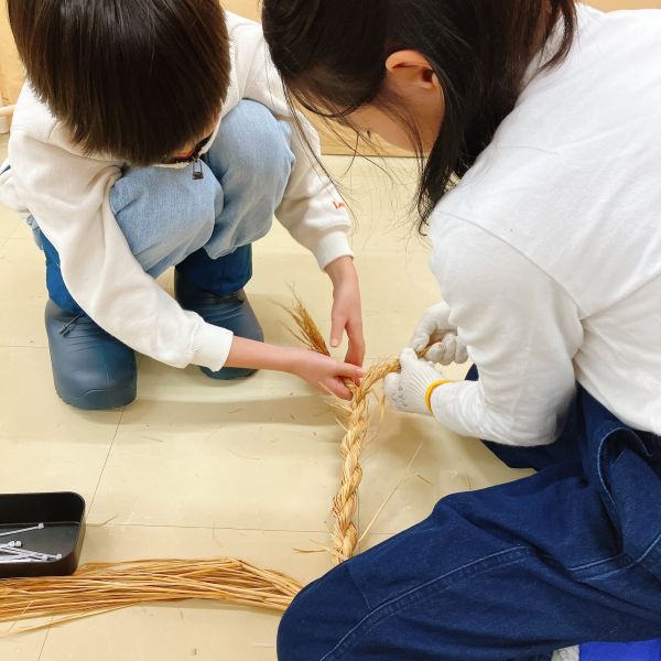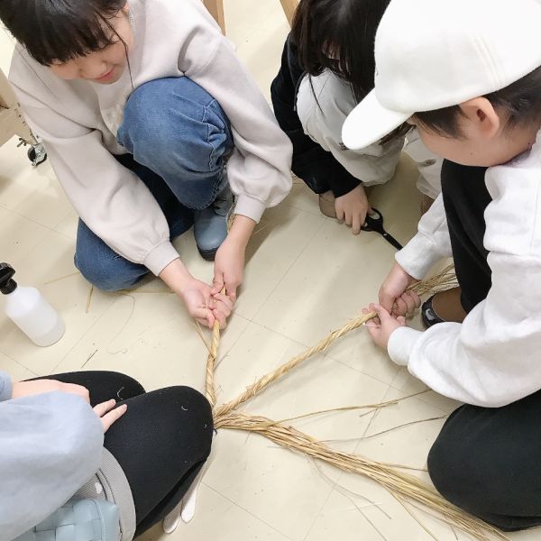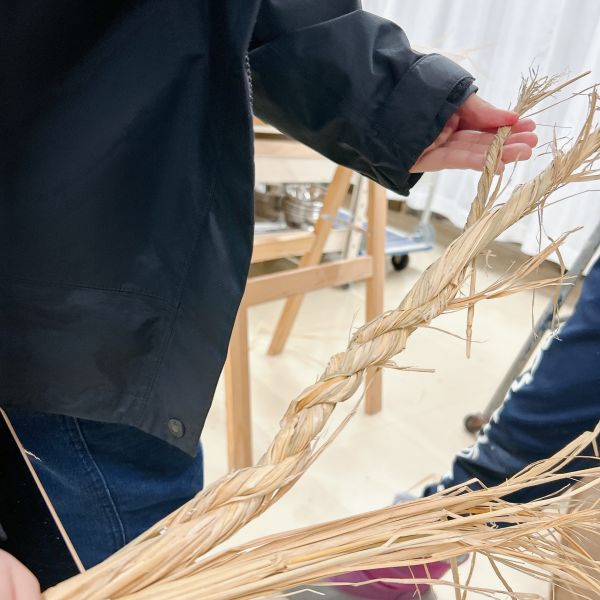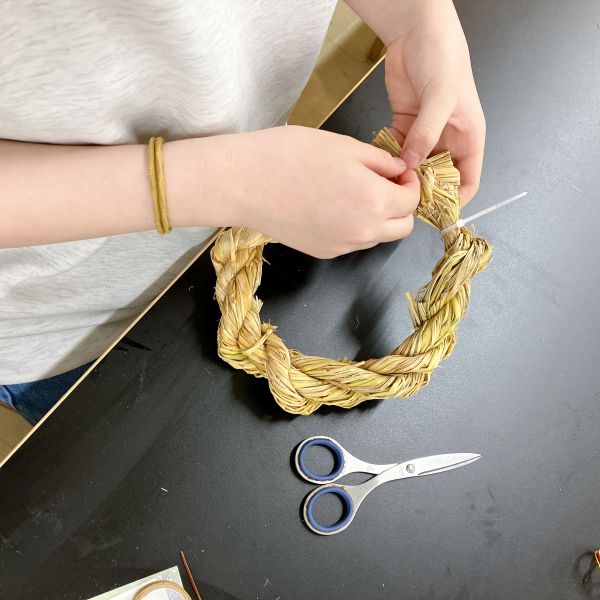 「待って待って、どっち回りだっけ?」「右からスタート?」「まずやってみよう」ふたりで作り方を思い出しながら、手探りで作っています。縄を綯うなんて、普段はまずできない体験ですから、すごく新鮮!