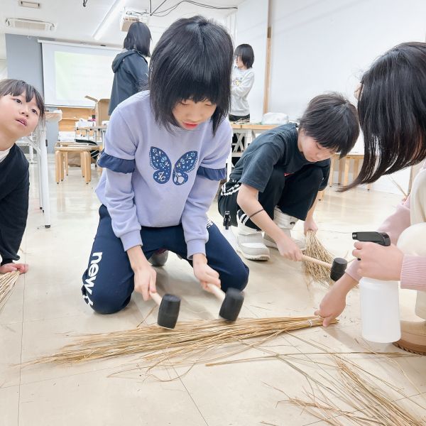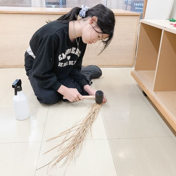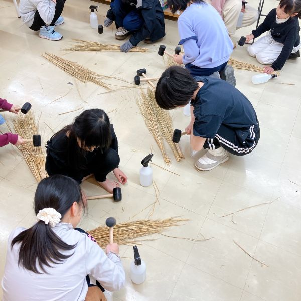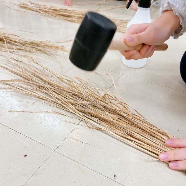 ただ叩くだけの作業と思ったら…実際やってみると、あんなにカサカサだった稲わらがだんだんとふんわりして、しっとりと柔らかくなっていくのがおもしろい様子。もう十分良い状態だよ!と伝えても「まだまだ叩きたい」という子も。