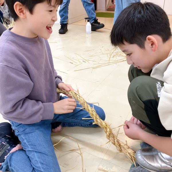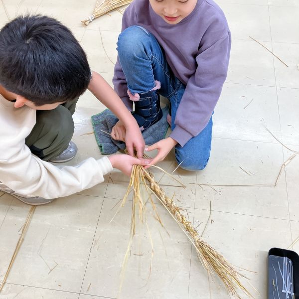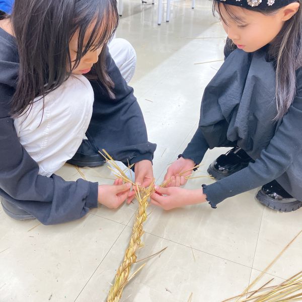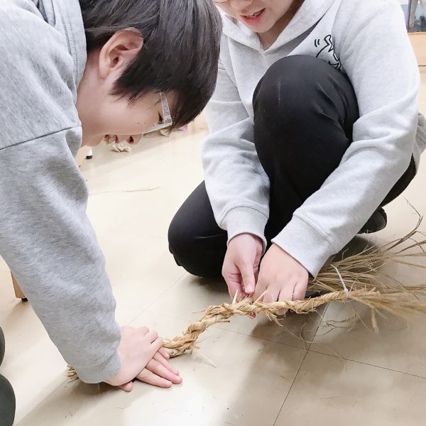 ぴったり息が合うと、きれいな縄ができていました。お見事!トルネードの子たちは、協力して作るのが上手な人が多いようです。それにしても、長年しめ縄を作り続けているおじいちゃん・おばあちゃんたちは、これをひとりでするというから驚きです。