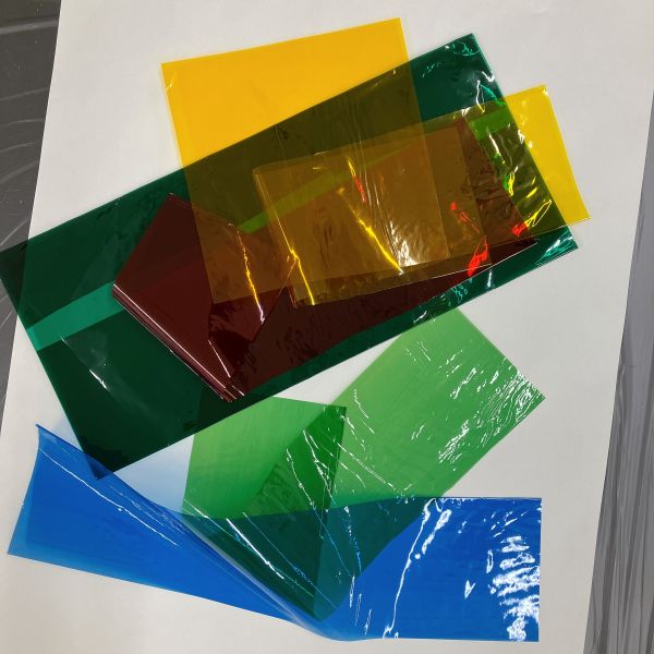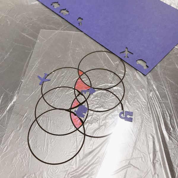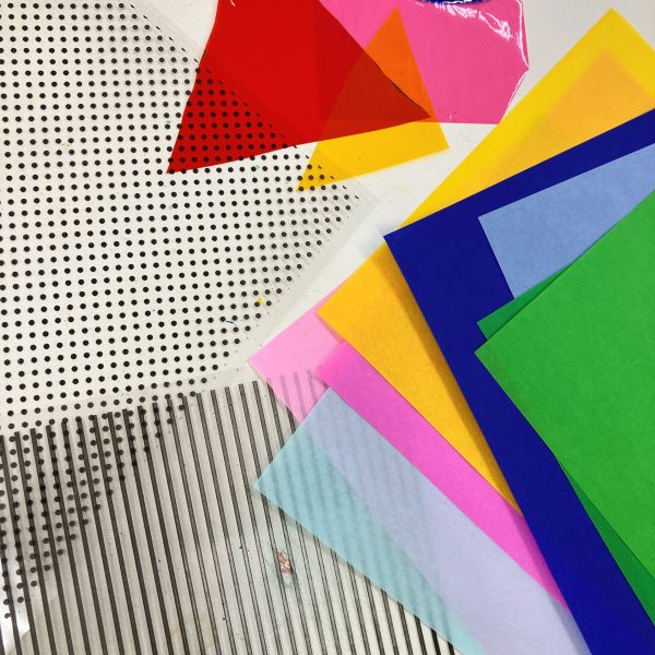 こちらでは「自分でも何なのかよくわからない形」を切って、それらを重ねたらきれいかなあ、と複数のシートに置いて実験中。ライトボックスの上であれこれ展開してみています。不思議な抽象画が現れる様子は、すごく魅力的!