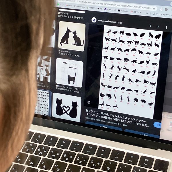 それぞれの興味や好みを反映させやすい制作のようで、みんなのアイディアが見事にバラバラでした。「猫が登場する舞台にしようかな!」と思いついたこちらの子は、猫の姿をインターネットで検索。猫はいろんなポーズが出てきて、参考にしやすそう。