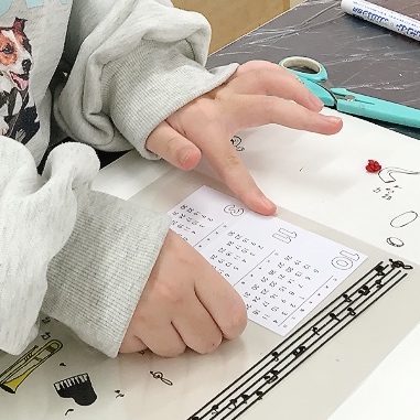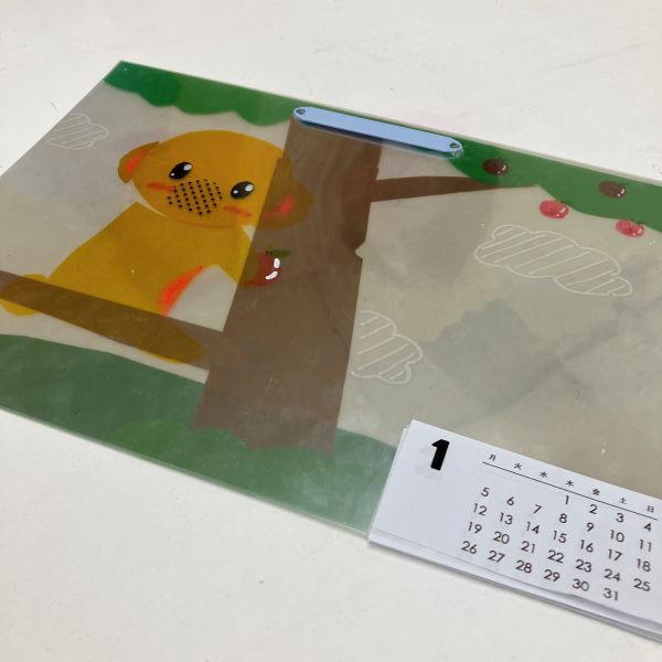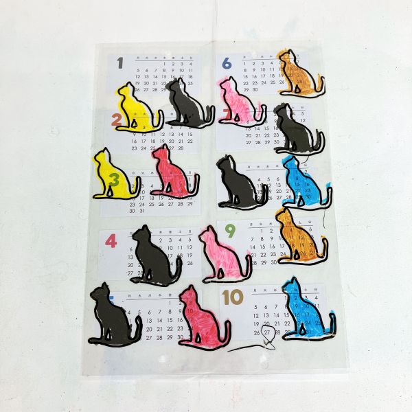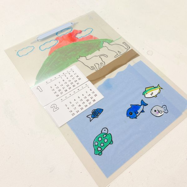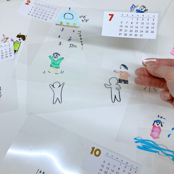 こどもたちの透明絵画の制作がそれぞれ進む中、カレンダーにするために暦のシートを配布。どこに置く?どう見せる?月毎にめくり、入れ替わる絵と一緒に、カレンダーの仕上げを考えていきました。