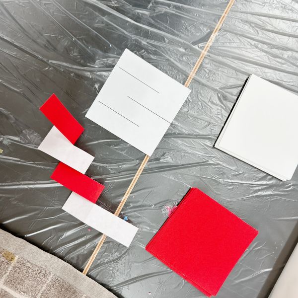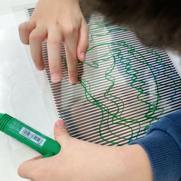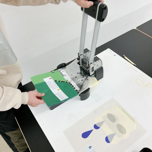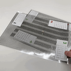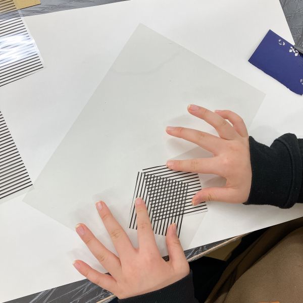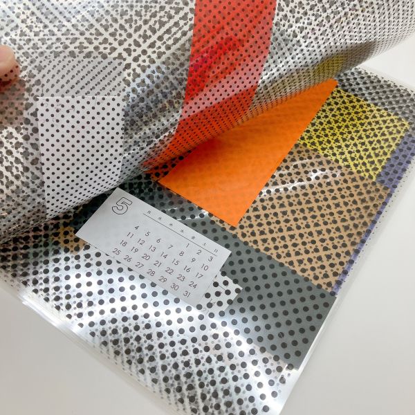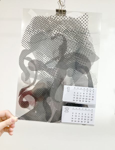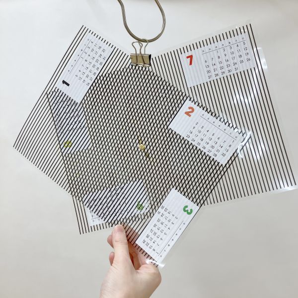 いろいろな可能性を試していたこちらの子。結果的に、2枚のストライプのシートを重ねてできる「モアレ」に魅力を感じた様子。なんとシートの真ん中あたりにリベットを留めるという斬新さで、カレンダーを仕上げていました。すごくユニークな発想!