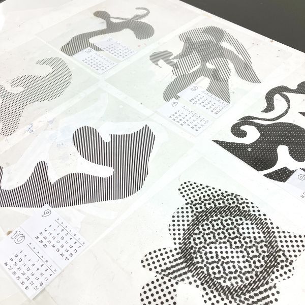 こちらは3ヶ月で1枚のカレンダー。1枚めくると木の色合いが変化し、その周りの様子とともに季節が変化していきます。重なりや見え方の配置もよく考えながら制作している様子です。