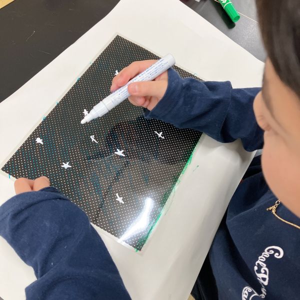 枚数を重ねるごとに、作品の世界観も深まっていくのがおもしろい。偶然の発見も多い制作で、ひとつのアイデアから、次のアイディアがどんどん出てきました。こどもたちの制作に、熱が入る!