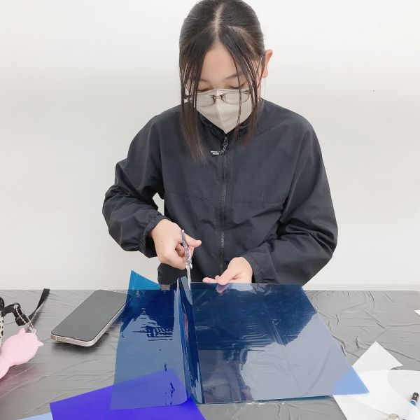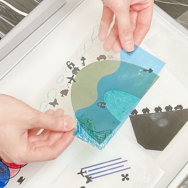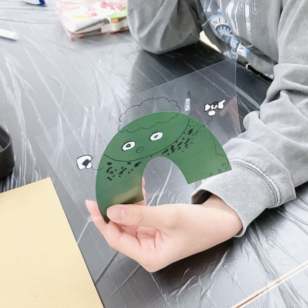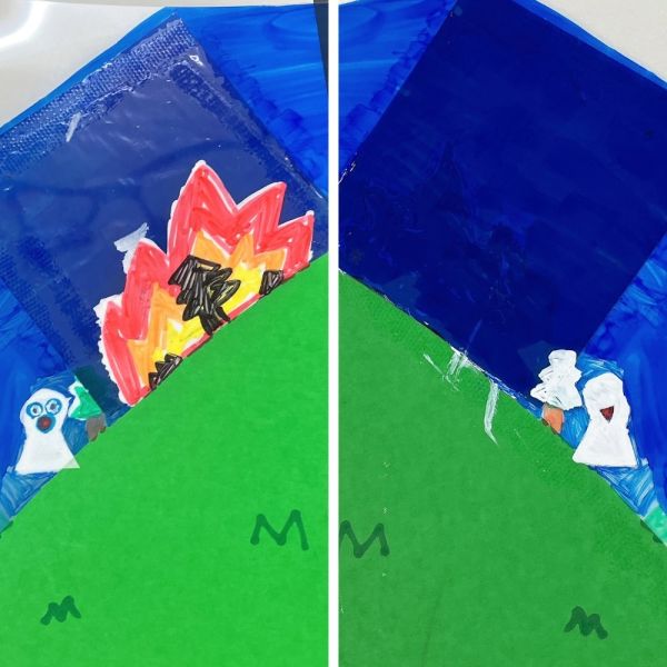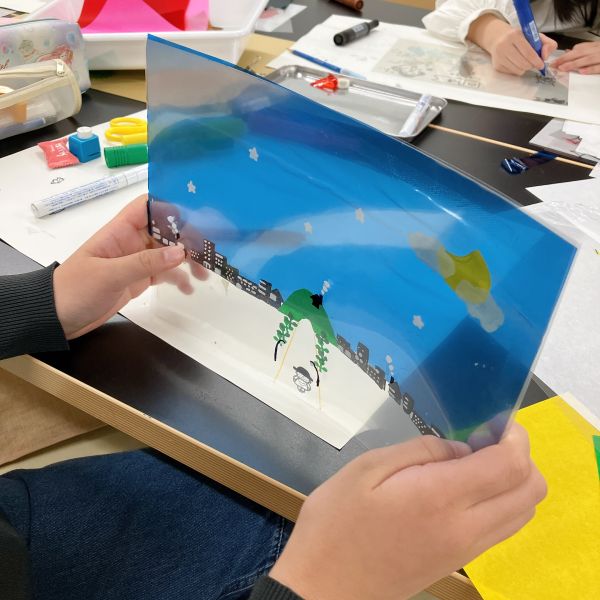 「いいことを思いついた!」と手を動かしていたこちらの子は、透明と不透明の素材を組み合わせて、表と裏でちがう絵に。片面は平和な山に見えますが、裏面では山火事が発生!?
