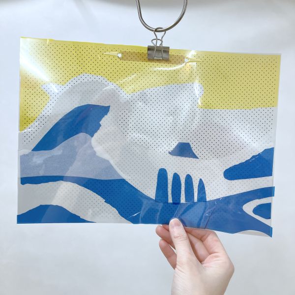 海辺の風景にドット模様を挟んでみると、一気に砂感が増してきた!ポップな仕上がりになりましたね。透明/不透明を効果的に試しながら、最後まで実験と発見が続いていました。