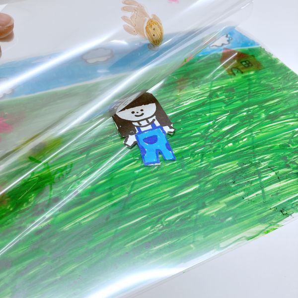 こちらの子は、緑の絵のベースの上に、フルーツを描いたシートを配置。いろんなフルーツのシートを作って、入れ替えができる絵になっています。なるほど、これだと季節感も表現できそうですね!