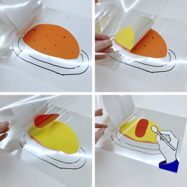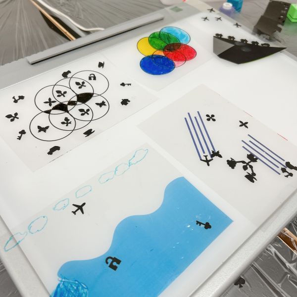 透明な素材と不透明な素材を組み合わせたり、上下や表裏をひっくり返してみたり。自由に絵を描き足すのもOK!いろいろ試しているうちに、空と海、空と山など、絵の中に奥行きや空間、何かの場面が見えてきました。