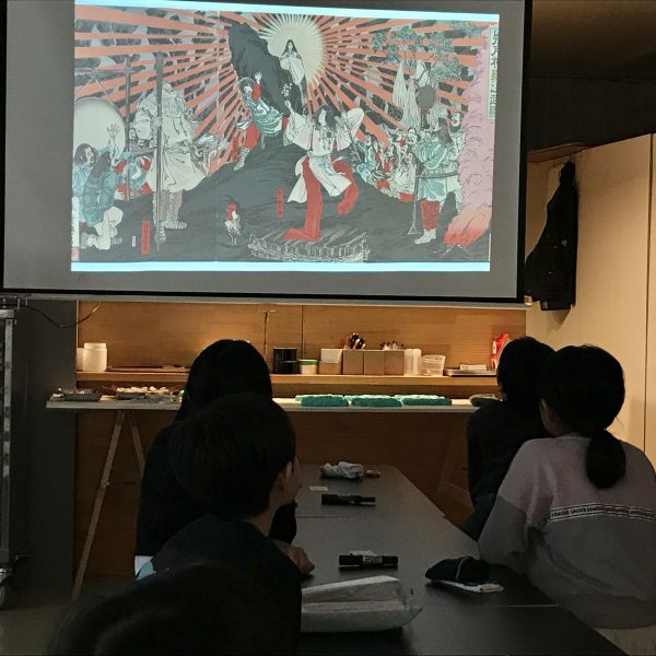 稲わらを使った制作の第二弾、今回はお正月に向けてしめ縄づくりに挑戦!まずはじめに、日本神話の『天の岩戸開き』の場面が描かれた絵を紹介。中央にいるのが天照大神。この神様が隠れてしまうと世界が暗闇になってしまうので、「もう二度と隠れないでください」という願いを込めて結界が張られました。そこで使われたのが、しめ縄なんですって。